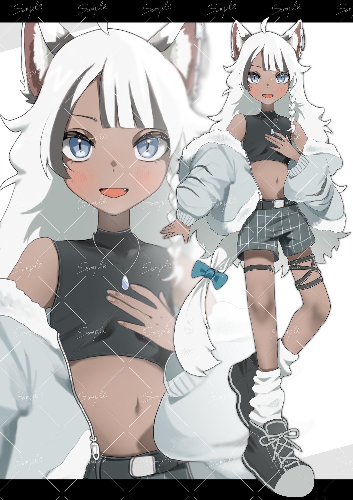1girlanimal earsbeltblack beltblack hairblack shirtblue eyesbowbraidcrop topdark skinfangfur trimgrey jacketgrey shortshand on own chestjacketjewelryjupter monlong hairmulticolored hairmultiple viewsnavelnecklaceoff shoulderopen mouthshirtshortssleevelesssleeveless shirtsmilesockstailthigh strapwatermarkwhite hair