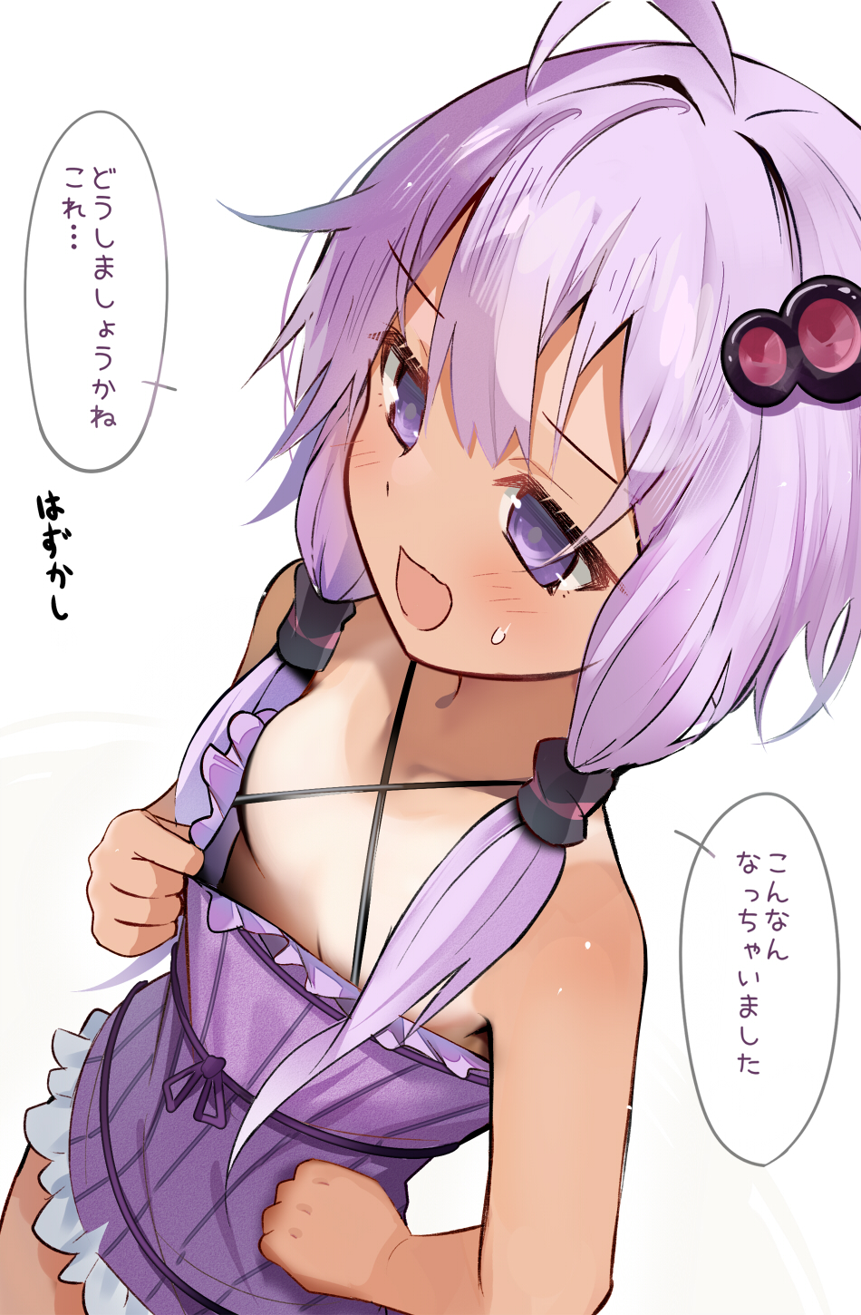 1girlahogebare armsbare shouldersblushbreastscollar tugcollarbonecowboy shotcriss-cross halterdownblousedressfrilled dressfrillsfrom abovehair between eyeshair ornamenthalter dresshalterneckhand on own hiphand uplong hairlooking aheadno braopen mouthpurple dresspurple eyespurple hairpurple ribbonribbed dressribbonshort dressshort hair with long lockssidelockssimple backgroundsmall breastssolospeech bubblesunburnsweatdroptantanlinewhite background