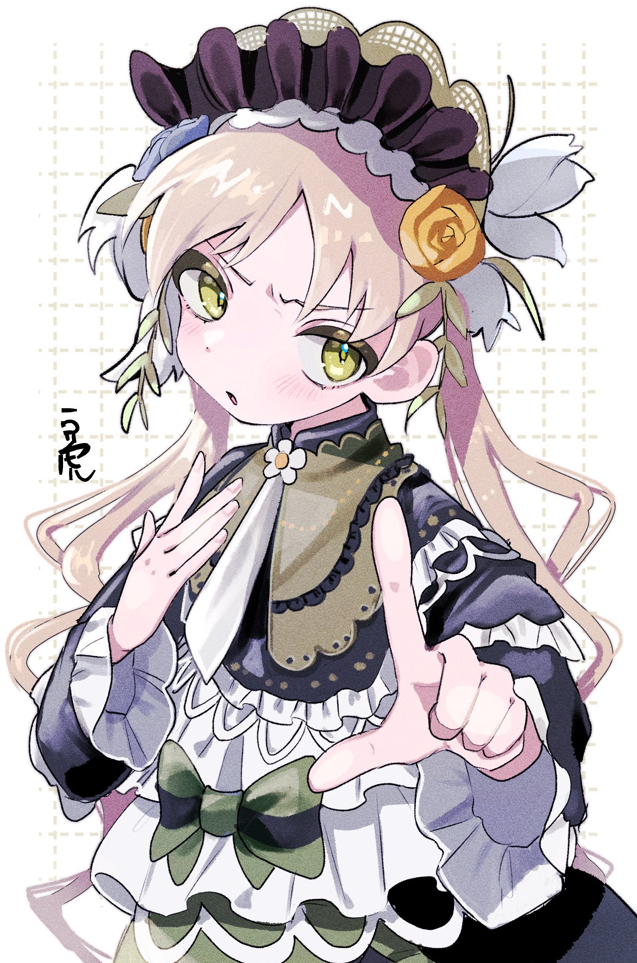 1girlblack dressblonde hairblushbowcapeletdressflowerfrilled dressfrillsgreen eyesgrid backgroundhair flowerhair ornamentjupter monlolita fashionlong hairlong sleeveslooking at vieweropen mouthpointingpointing at viewerrosesolotwintailsupper bodywhite backgroundyellow eyesyellow floweryellow rose