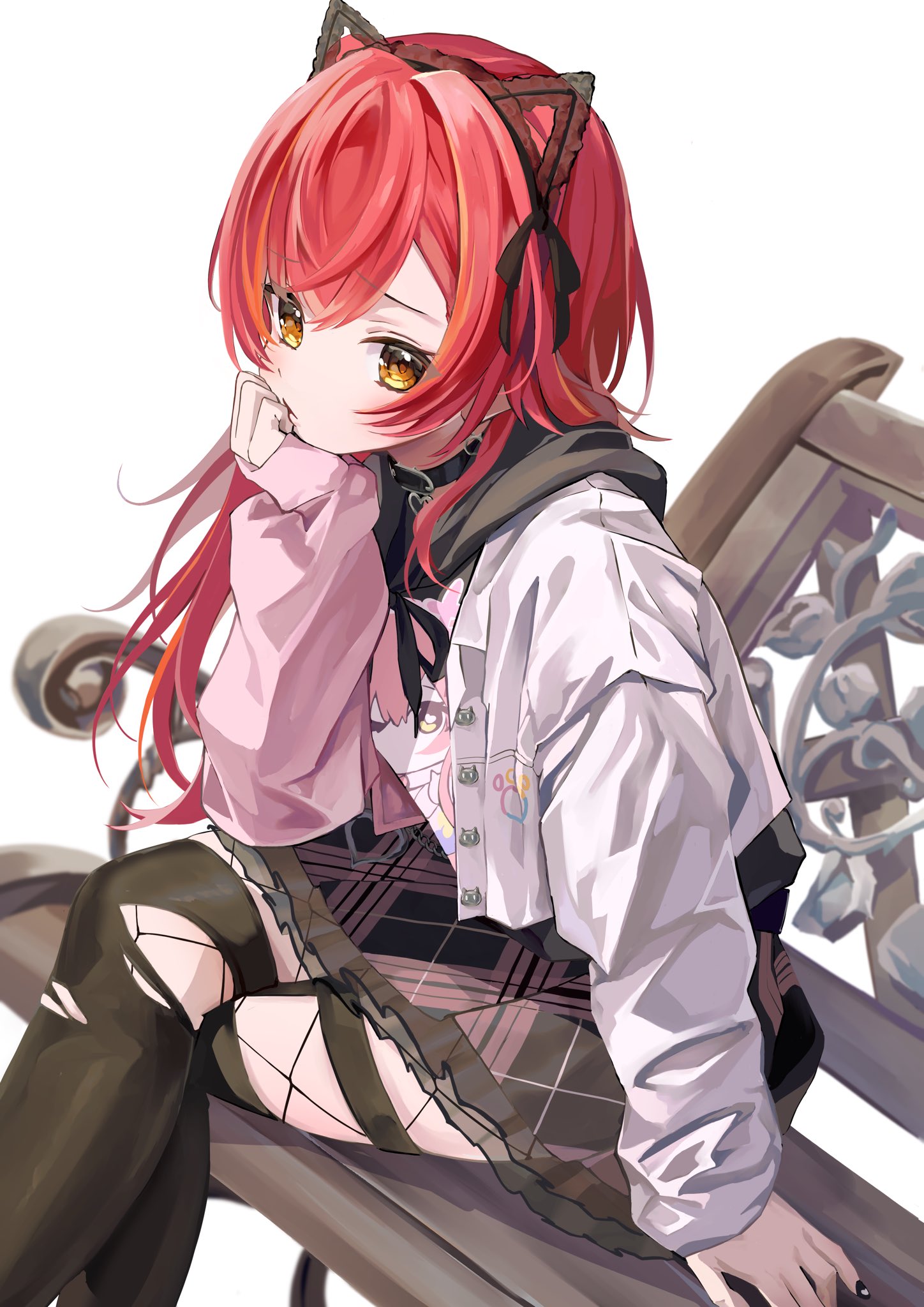 1girlbenchblack hoodieblack ribbonblack thighhighschokercrossed legsfishnetshair ribbonhead resthoodhood downhoodiejacketlong hairlong sleeveslooking at viewermulticolored hairopen clothesopen jacketplaid clothesplaid skirtred hairribbonsittingskirtsolothighhighstorn clothestorn thighhighsvirtual youtuberwhite backgroundwhite jacketyellow eyes