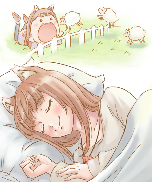 00s1girlanimal earsbedbrown hairchibiclosed eyesdreaminghead on pillowpillowsheepsleepingsmilewolf ears