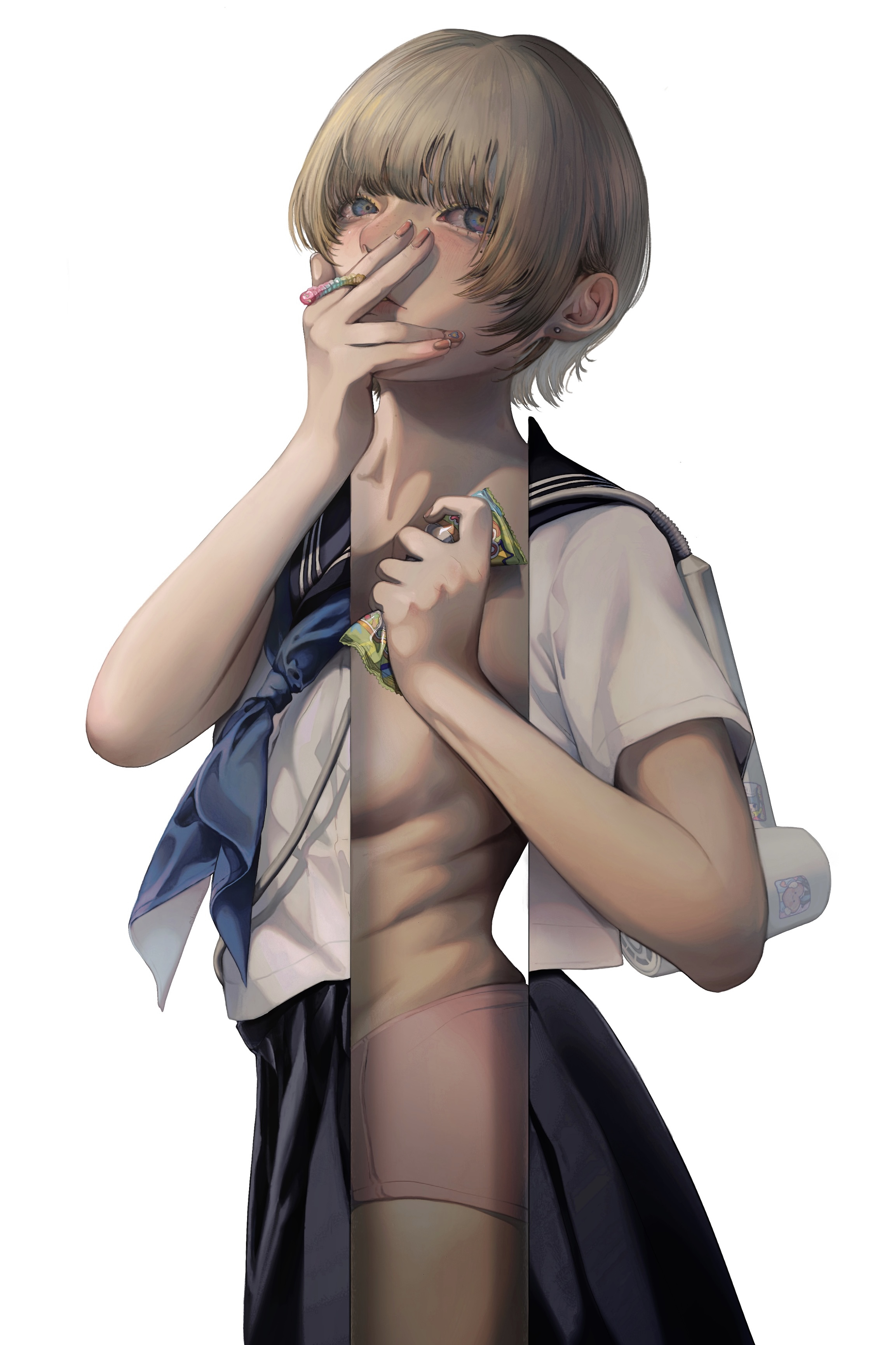 1girlblue eyesblue necktiebreastsear piercinggummy wormmolemole under eyenecktiepiercingschool uniformserafukushort hairsimple backgroundskirtsolowhite background