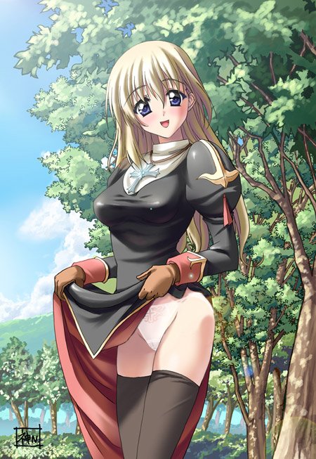 kawase seiki, takase mizuki, comic party, 00s, 1girl, bow, bow panties, breasts, clothes lift, covered erect nipples, female focus, greyscale, hair bow, kneeling, lace, lace-trimmed panties, lace trim, large breasts, lifting own clothes, lineart, long hair, monochrome, open mouth, panties, school uniform, serafuku, side ponytail, skirt, skirt lift, solo, thighhighs, underwear