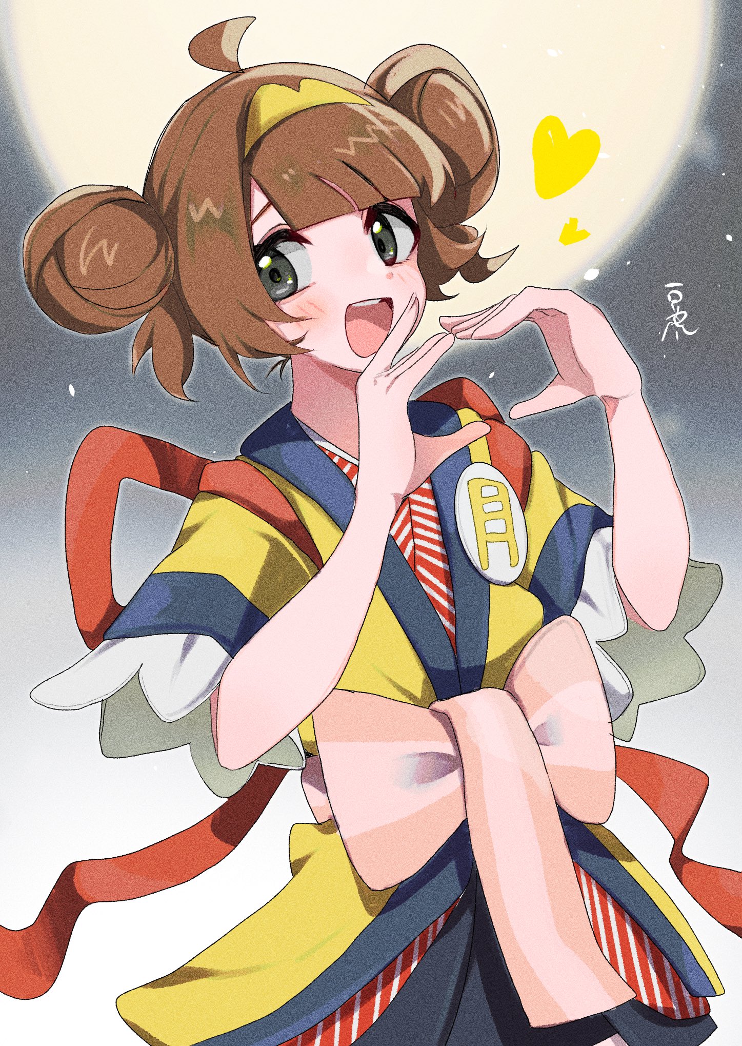 1girlbadgeblushbowbrown hairbutton badgedouble bunfull moongrey eyeshair bunheartheart handsimadake tsukimi tabemijapanese clothesjupter monkimonolooking at viewermoonopen mouthpink bowshort sleevessmilesoloupper bodyyellow kimono