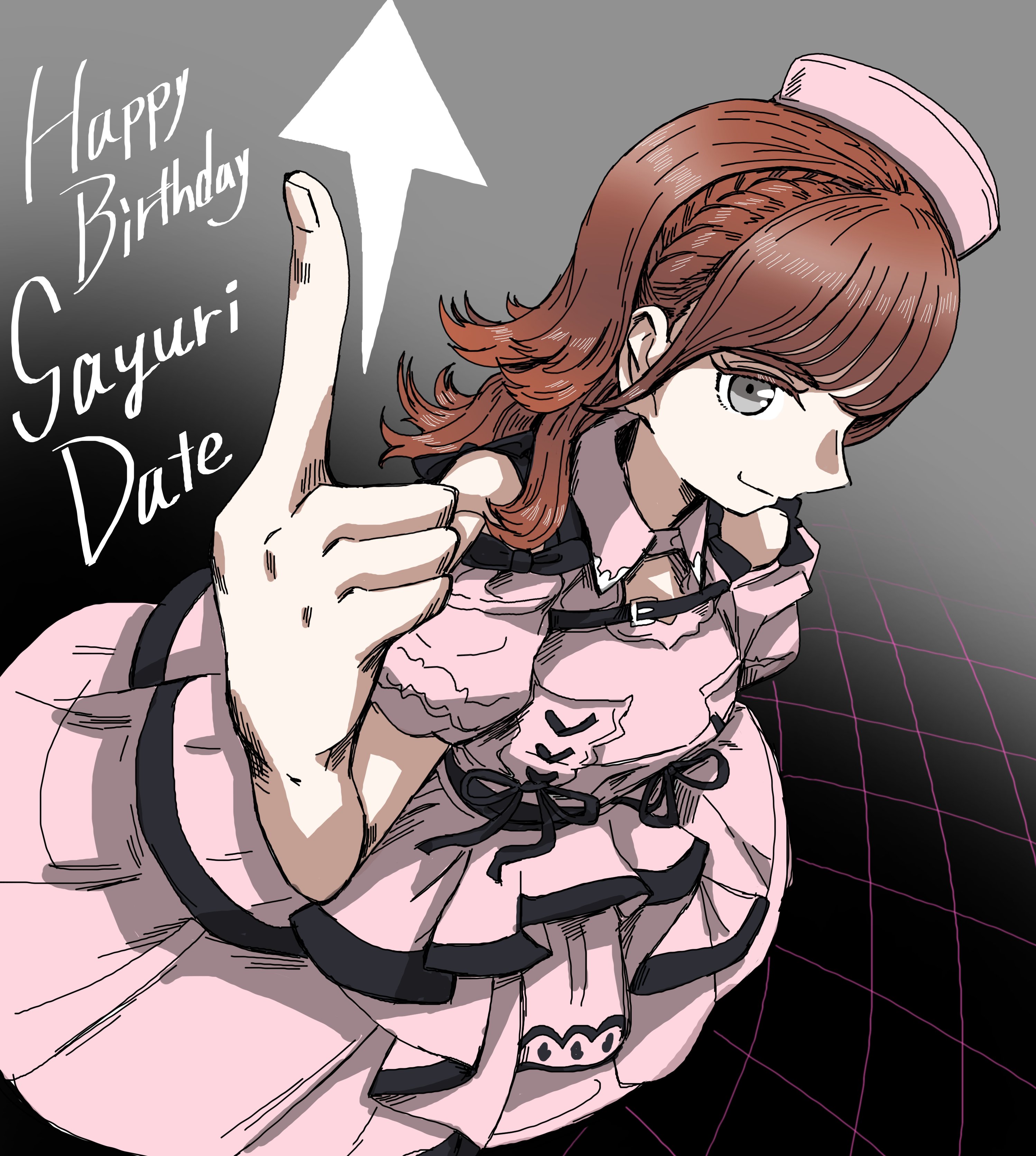 1girlanimificationarrow (symbol)bare shouldersbraidbrown hairclosed mouthdressgrey backgroundgrey eyesgrid backgroundhatlong hairlooking at viewerpink dresspink hatpointingpointing upshort sleevesside braidsmilesolovoice actor