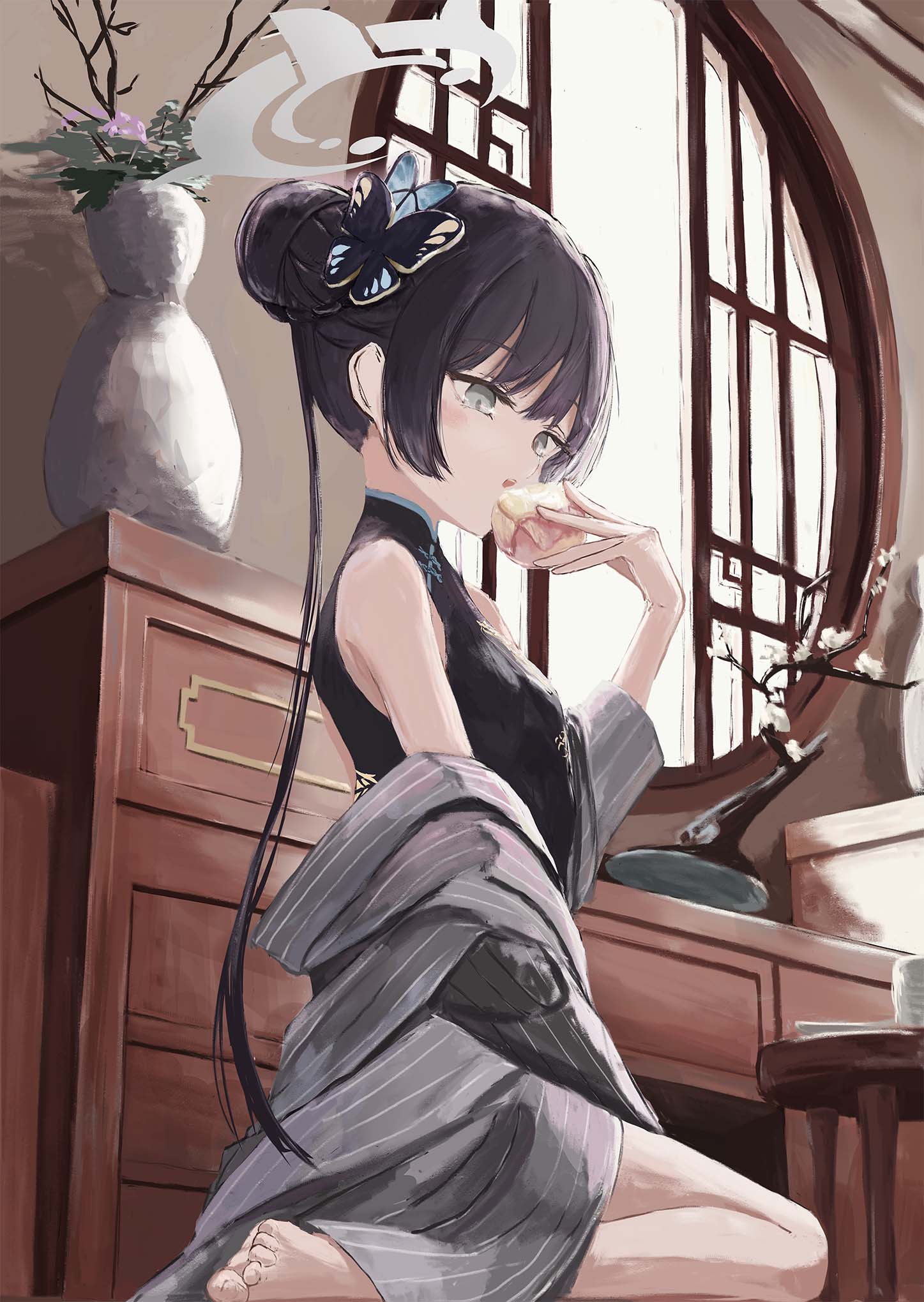 yuki onna (nurarihyon no mago), nurarihyon no mago, 1girl, black hair, crazy eyes, crossover, female focus, japanese clothes, kimono, long hair, parody, reference, ringed eyes, scarf, simple background, solo, white background, yukata, yuki onna