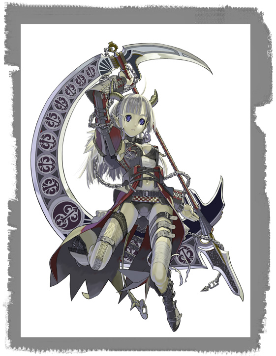 asymmetrical clothesbandagesbeltblue eyeschainhornslong hairnavelpointy earssingle thighhighsolothighhighsweaponwhite hair