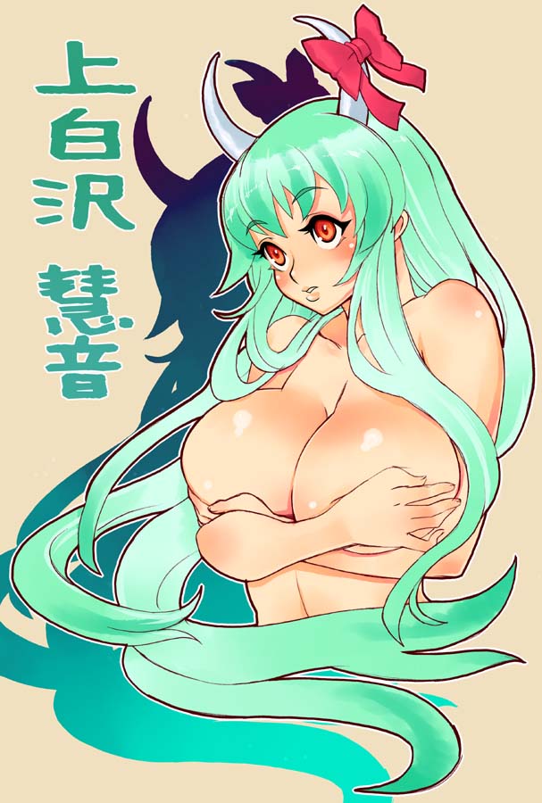 1girlbreastscovering breastscovering privatesfemale focusgreen hairhornshuge breastslong hairnudenude coverorange eyesribbonsoloupper body