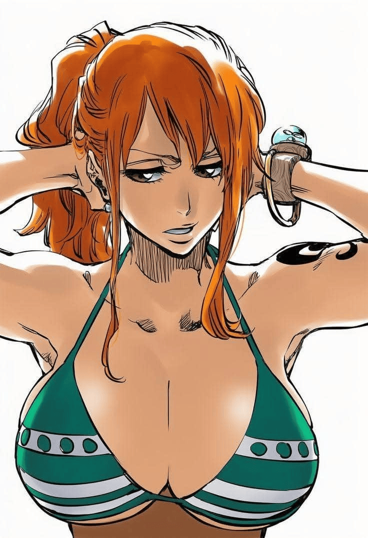 bare shouldersbikinibikini top onlybreastsbrown eyescleavagehand in own hairlarge breastslong hairorange hairteeth