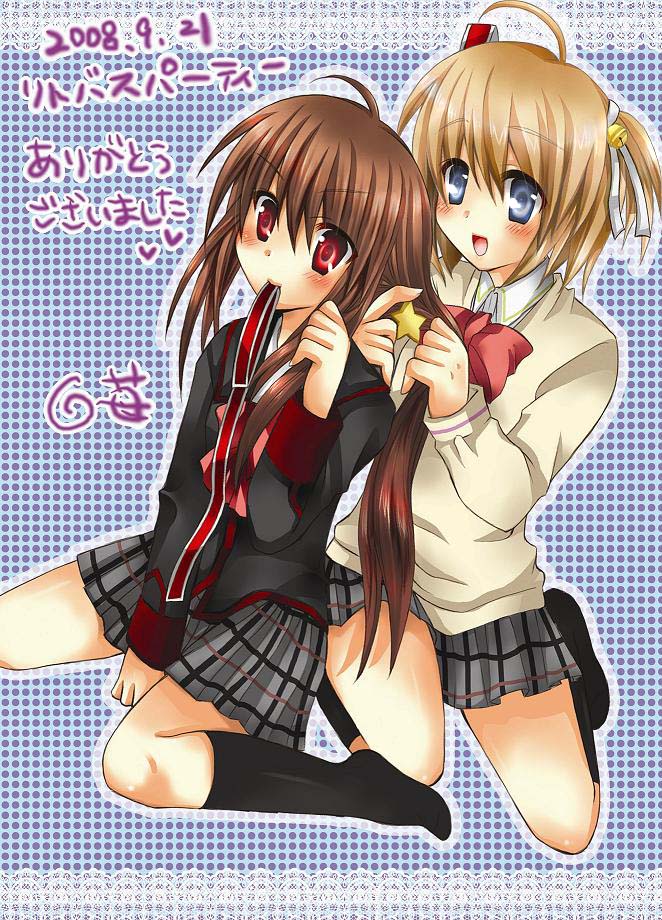 2girlsaqua eyesblonde hairblue eyesblushbowbrown hairhair ribbonkneelinglong hairmouth holdmultiple girlspink bowplaid clothesplaid skirtponytailred eyesribbonschool uniformserafukushort hairskirtthighhighs
