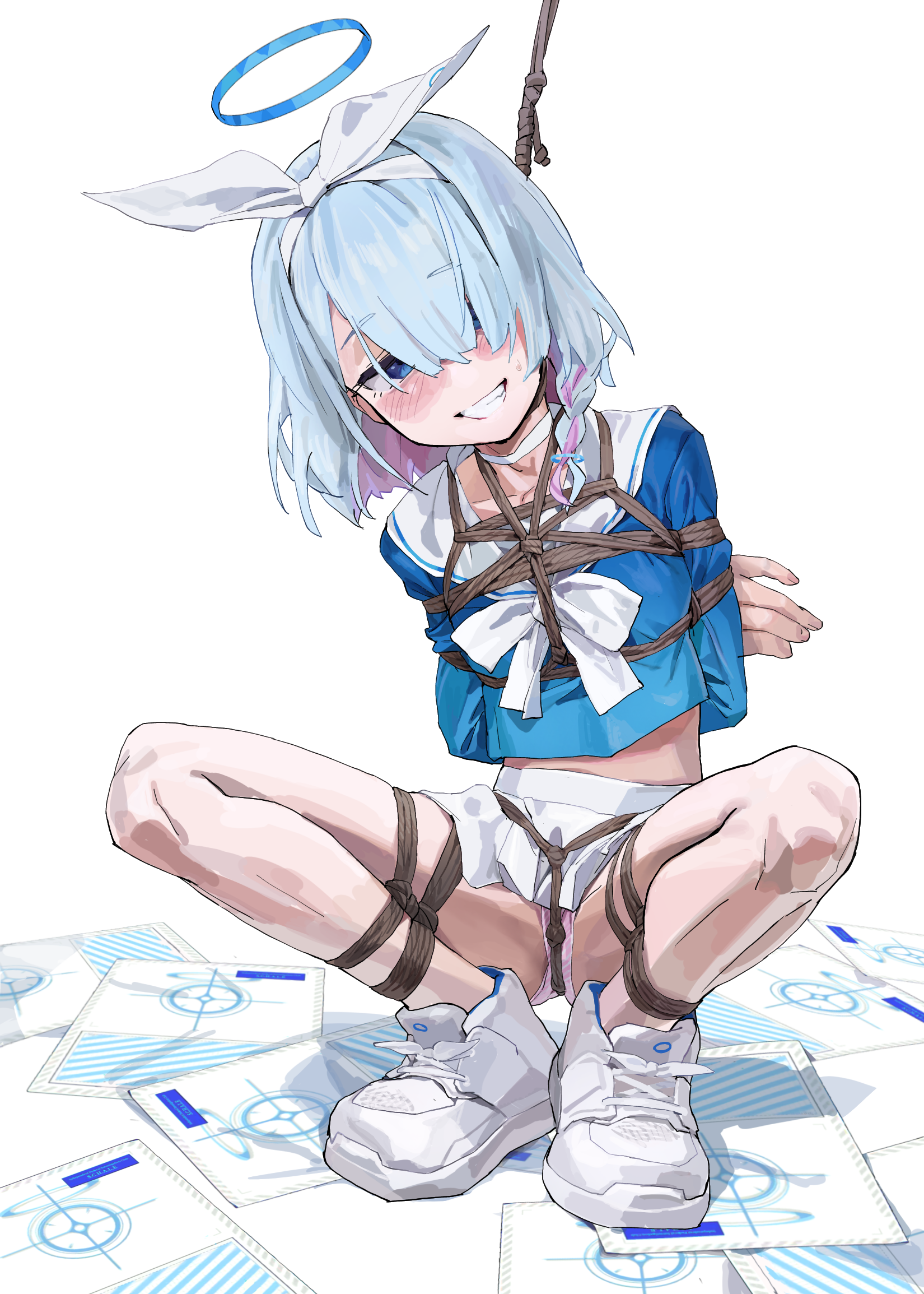 1girlarms behind backbdsmblue eyesblue hairblue shirtbondageboundbreast bondagebreastschokerclenched teethcollarbonecrotch ropefrogtiehair over eyeshaloheadbandlong hairlooking at vieweropen mouthpantiespink pantiespleated skirtshibarishibari over clothesshirtshoesskindentationskirtsmall breastssneakerssolosquattingteethunderwearwhite choker