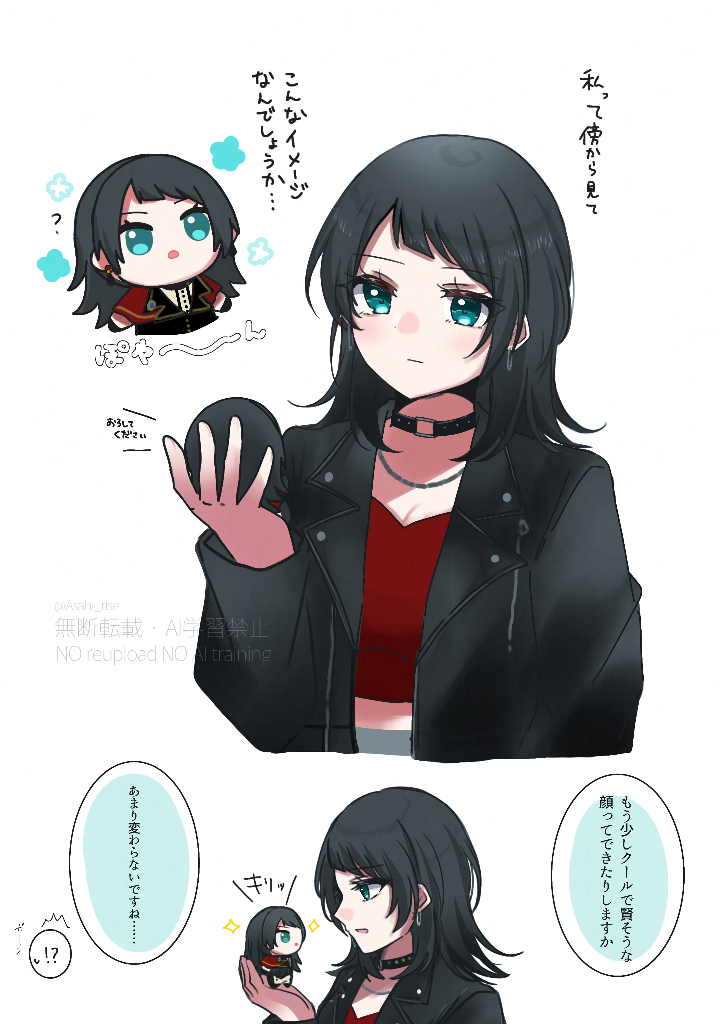 1boy1girlaqua eyesblack chokerblack hairblack jacketbreastscharacter dollchibichibigurumichokercleavageclosed mouthdollexpressionlessflipped hairin palmjacketlooking at dollmedium breastsmedium hairo-ringo-ring chokeropen clothesopen jacketopen mouthred shirtshirtsparklespoken interrobangstudded choker