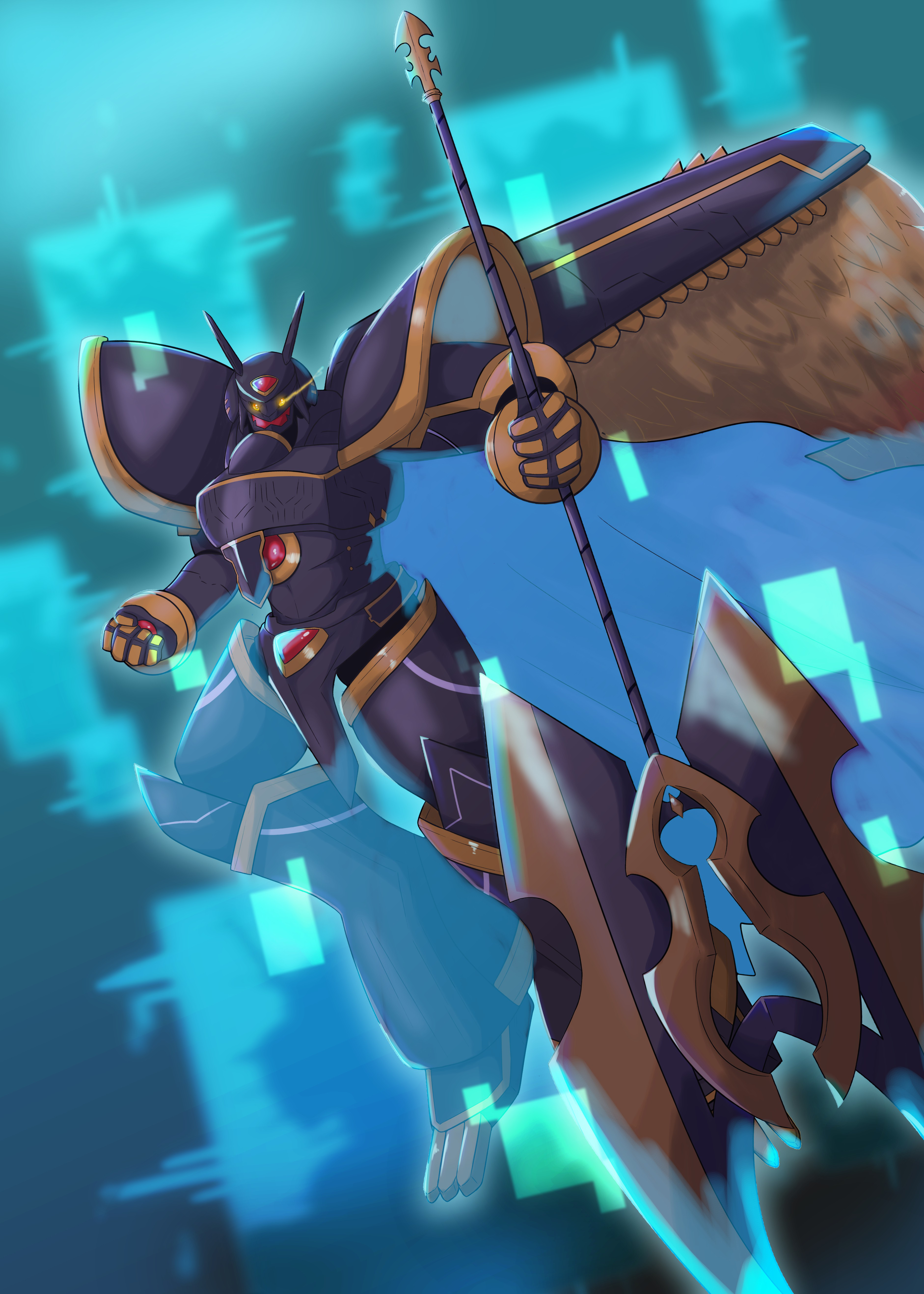 armorblack armorblack helmetblue backgrounddigimon (creature)feathered wingsforehead jewelfull bodyglowingglowing eyeshelmetknightwingsyellow eyes