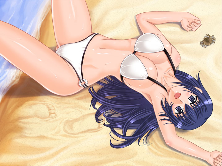 beachbikiniblue eyesblue hairbreastscrabcrustaceandaylarge breastslyingsoloswimsuitwhite bikini