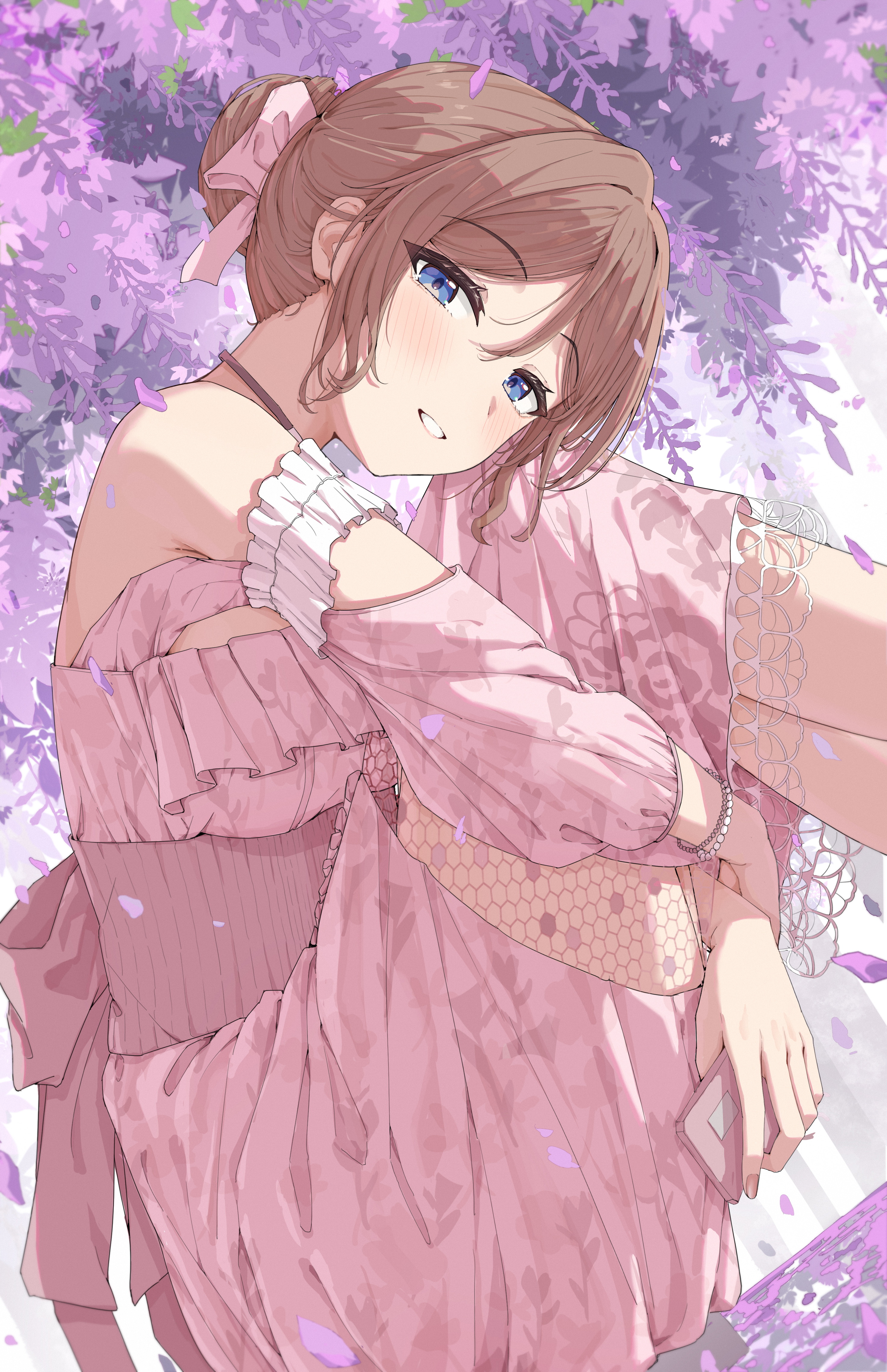 1girlblue eyesblushbrown hairdressfalling petalsfeet out of framefloral printfrilled dressfrillshair bunhugging own legsknees uplooking at vieweroff shoulderoff-shoulder dressofficial alternate costumepetalssingle hair bunsittingsmilesolo