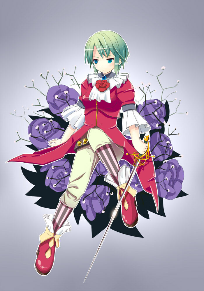 1girlbare legsblue eyesdressexpressionlessfemale focusflowerfull bodygreen hairgrey backgroundkneehighslong sleeveslooking at viewerred dressred flowerred roseroseshort hairsimple backgroundsittingsockssolostriped clothesstriped socks
