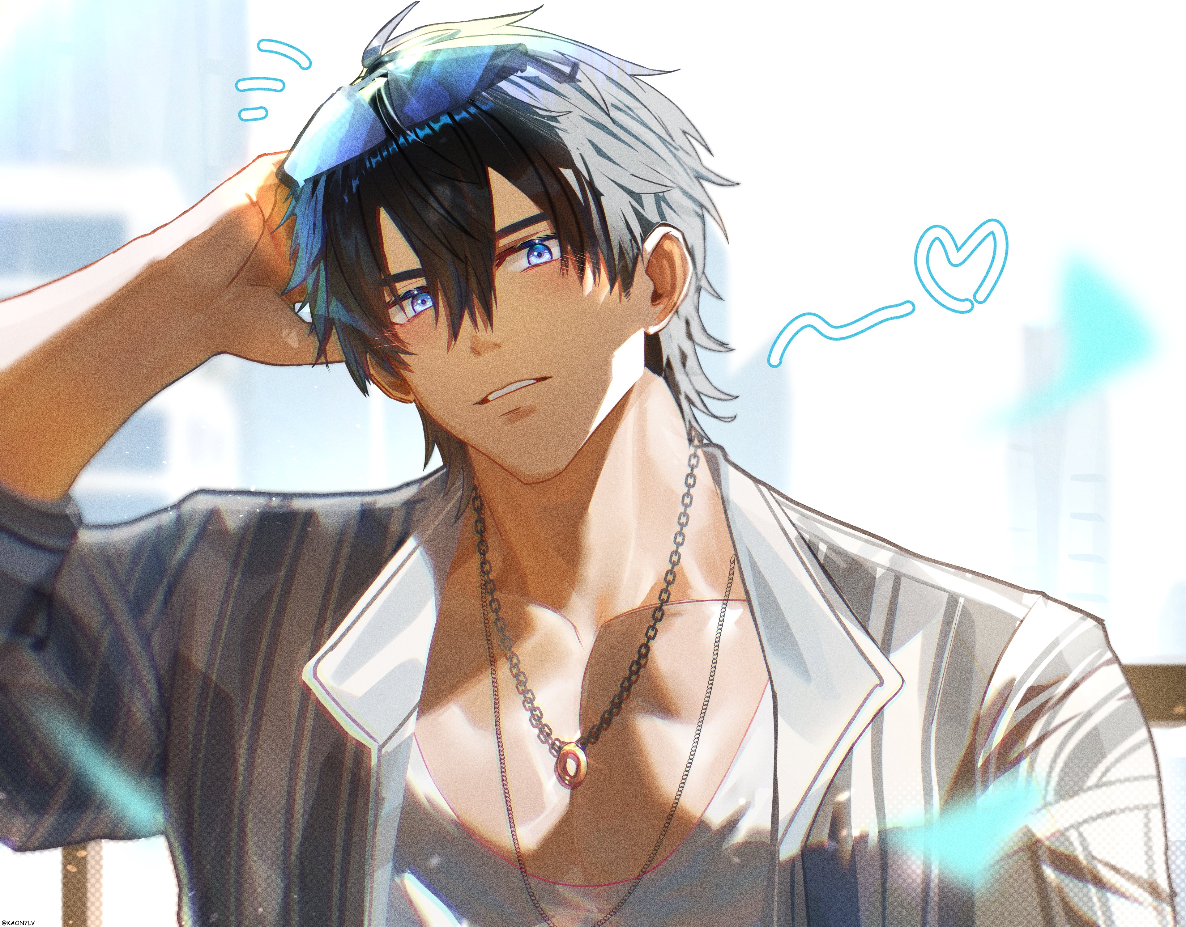 arm behind headartist nameblack hairblue eyesblushbreastscleavageclothing cutoutcollarbonedouble-parted bangseyewear on headhair between eyeshead tiltheartjewelrylight blushlight smilelong hairlooking at viewermale focusmuscularmuscular maleneck ringnecklacenotice linespectoral cleavagepectoralsrimless eyewearringshadowshirtsmilestriped clothesstriped shirtsunglassestwitter usernameunbuttonedunbuttoned shirt