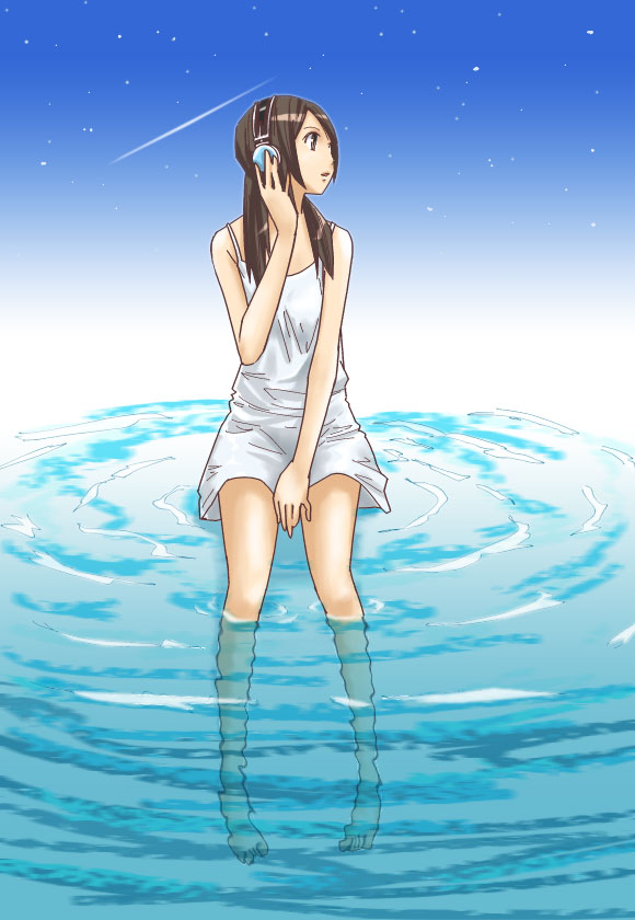 1girlbarefootbrown hairdressfemale focushand on headphonesheadphoneslegslong hairlong legspartially submergedripplesshooting starsittingskirtsoaking feetsolosundresswaterwhite dresswhite skirt