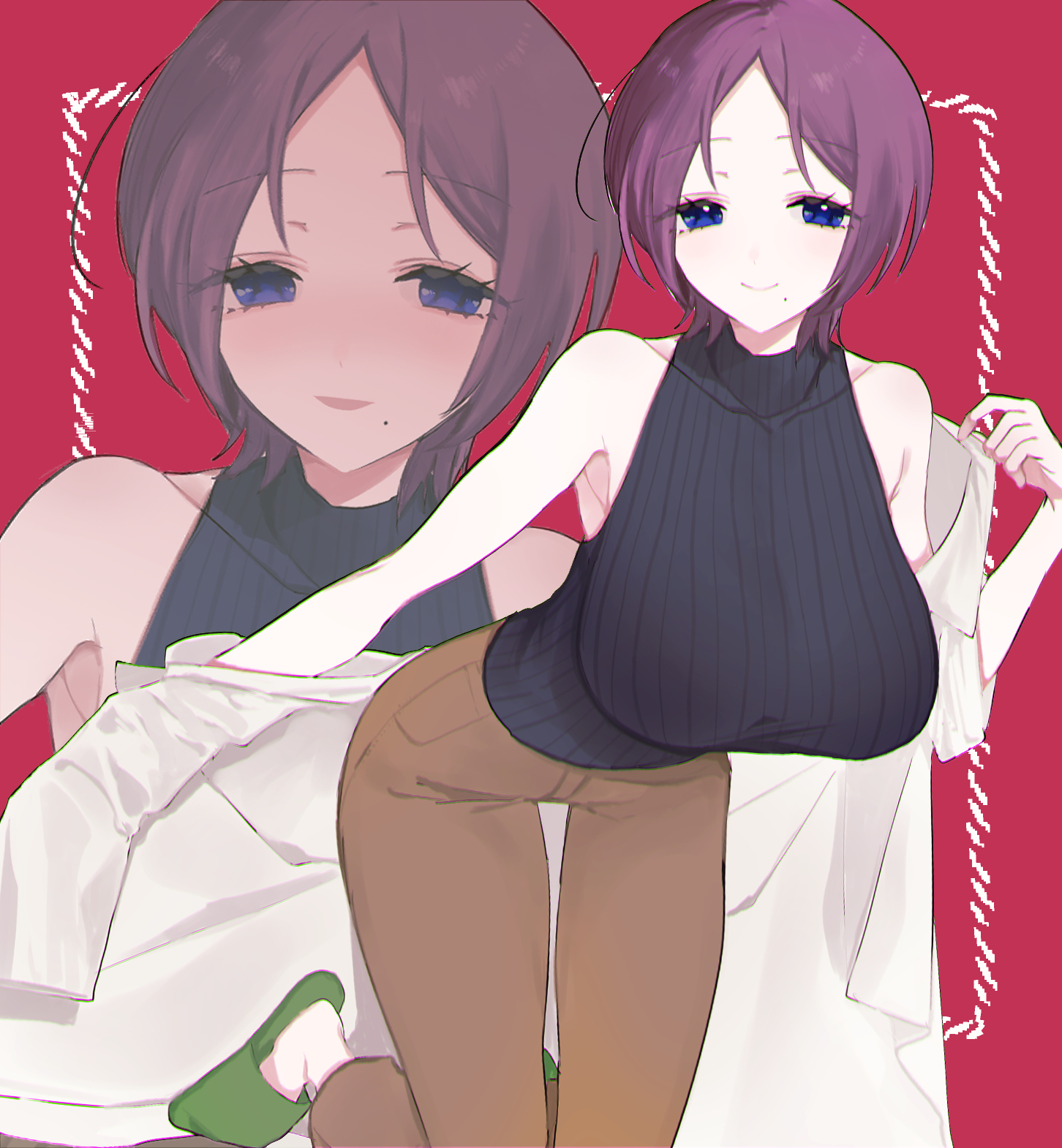 gaba33, momota kaito, danganronpa (series), danganronpa v3: killing harmony, commentary request, highres, 2boys, black jacket, closed mouth, coat, collared coat, collared shirt, dual persona, evil smile, expressionless, facial hair, from side, gakuran, goatee, hair over eyes, high collar, jacket, lapels, light frown, male focus, multiple boys, nostrils, official alternate costume, open clothes, open jacket, open mouth, pointy nose, purple coat, purple eyes, purple hair, school uniform, shirt, short hair, signature, simple background, smile, spiked hair, teeth, upper body, white background, white jacket, white shirt