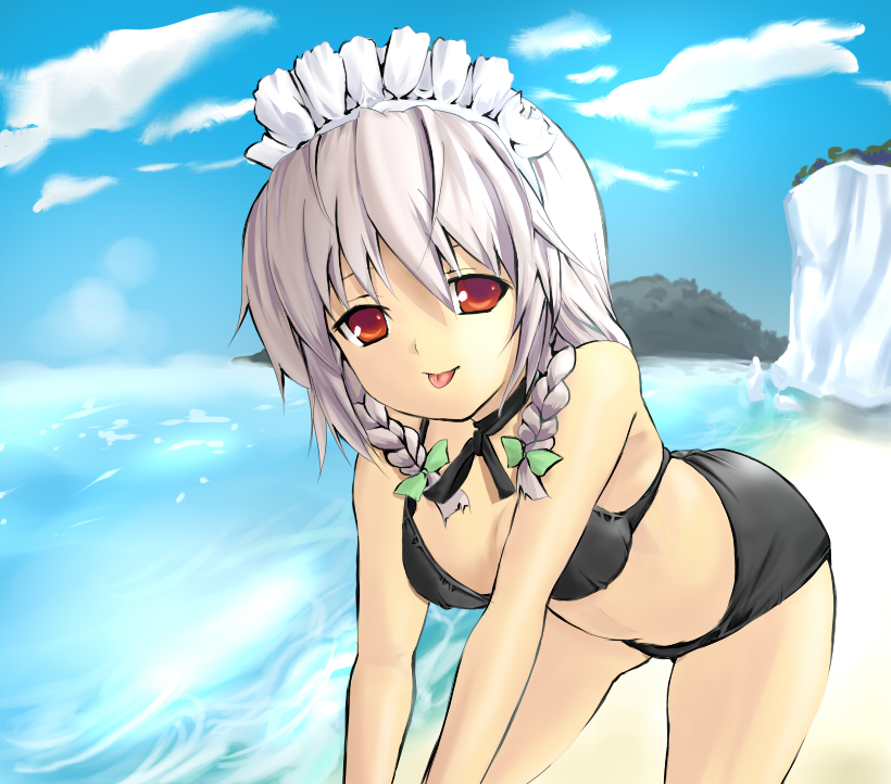 :p1girlall foursbeachbikiniblack bikinibraidbreastsdayfemale focusnatureoceanoutdoorsplantred eyesribbonshort hairskysoloswimsuittonguetongue outtwin braids