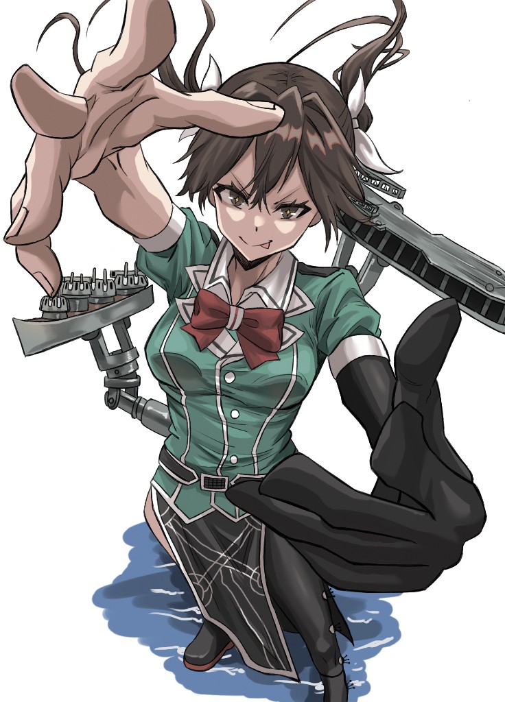 1girlasymmetrical legwearblack thighhighsbowbowtiebrown eyesbrown hairelbow glovesforeshorteningglovesgreen jacketjacketlong hairmachinerymilitary uniformmiyabi (miyabi mohu)pelvic curtainred bowred bowtieribbonsingle elbow glovesingle glovesingle thighhighsolothighhighstonguetongue outtwintailsuneven legwearwhite ribbon