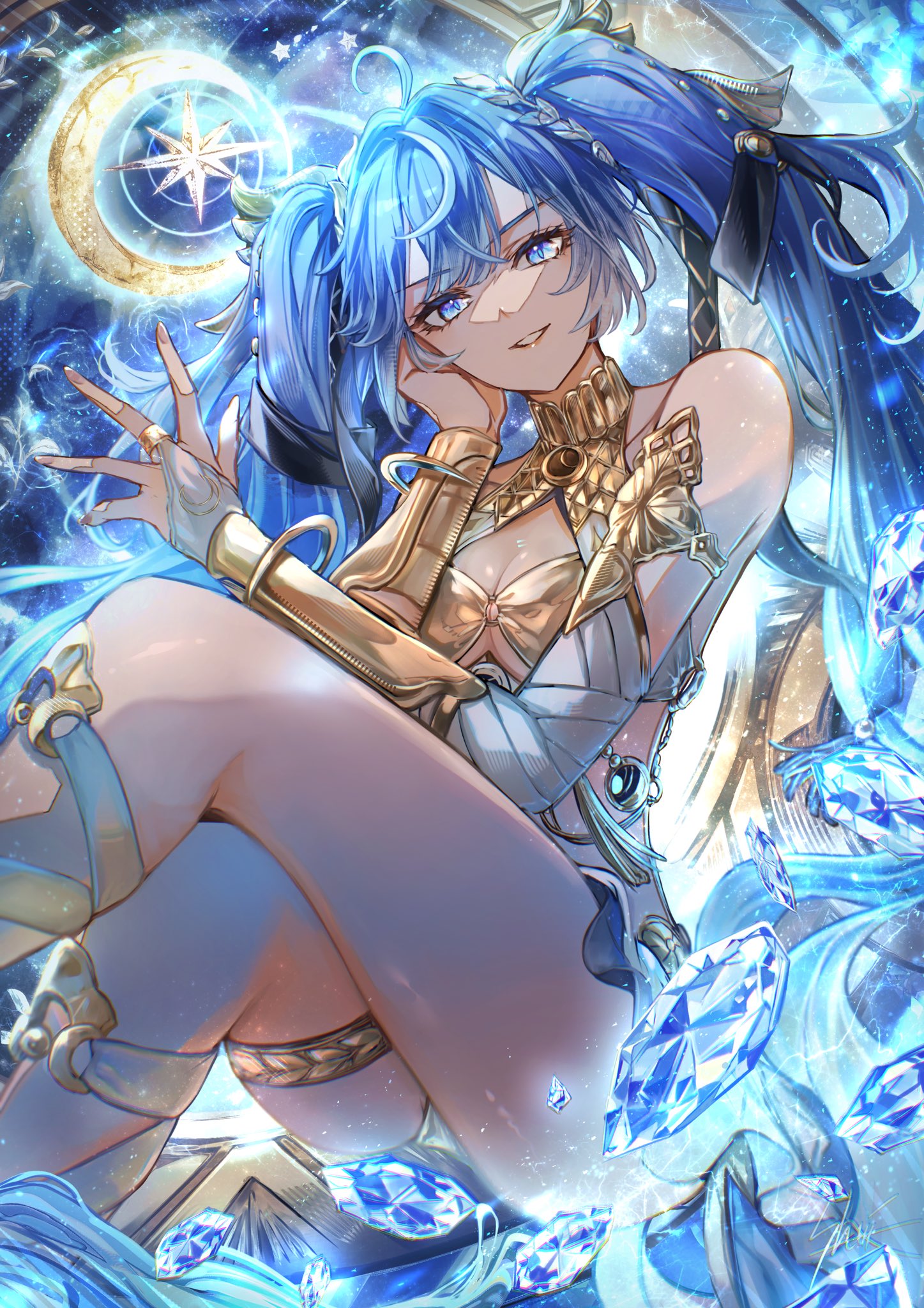 1girlahogearmletbare shouldersblue eyesblue hairbreastsbridal gauntletscleavagecrystalfeet out of framegold brahair beltjewelrylaurel crownlong hairlooking at viewermedium breastsmulticolored hairparted lipssingle bridal gauntletsittingsmilesolostreaked hairthighletthighstwintailsvery long hairwhite bridal gauntlets