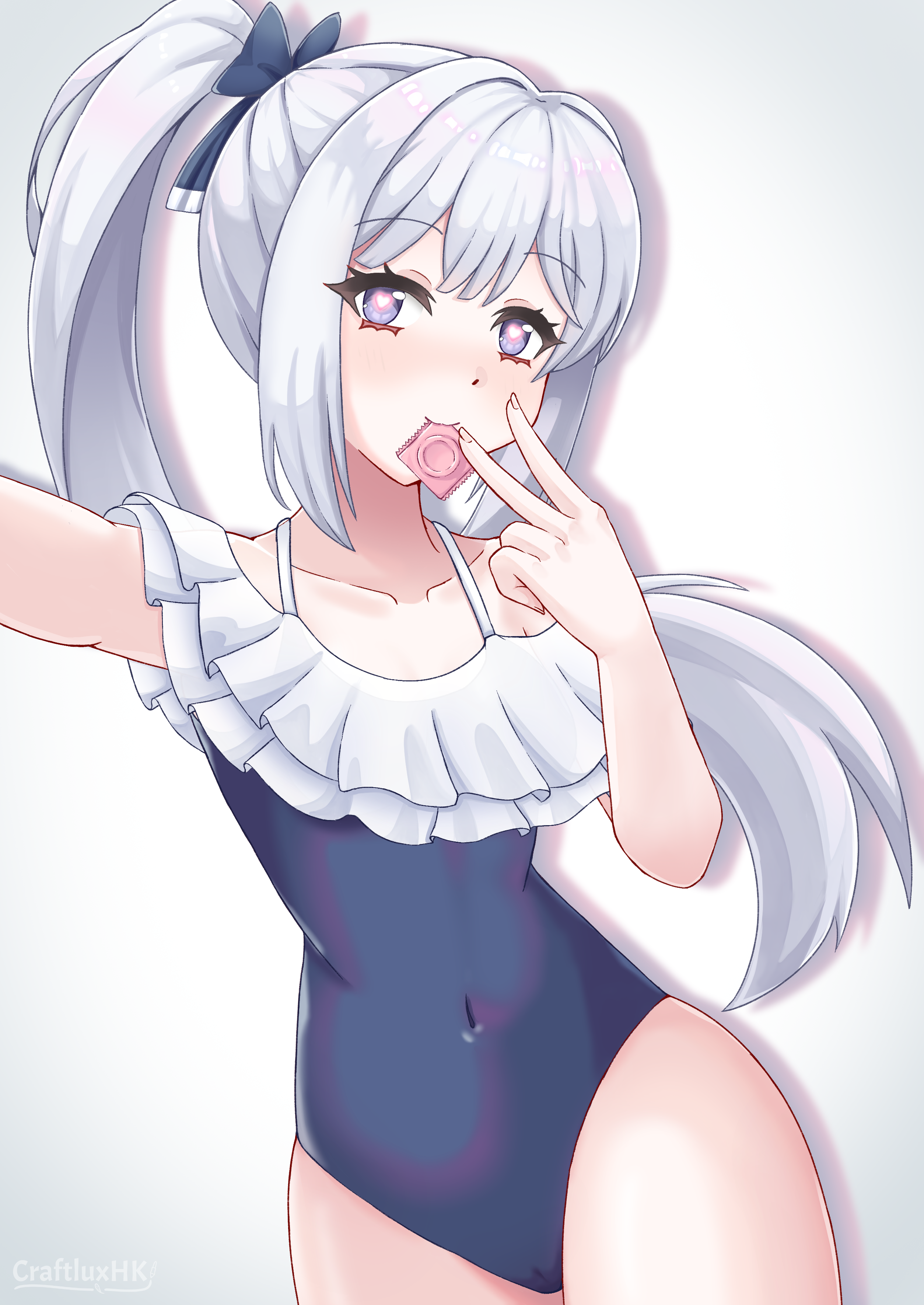 1girlblue one-piece swimsuitcasual one-piece swimsuitcondomcondom wrappercovered navelcowboy shotfrilled one-piece swimsuitfrillsgrey hairheartheart in eyelong hairlooking at viewermouth holdno halooff shoulderoff-shoulder one-piece swimsuitofficial alternate costumeone-piece swimsuitponytailpurple eyesselfiesoloswimsuitsymbol in eyetwo-tone one-piece swimsuitv