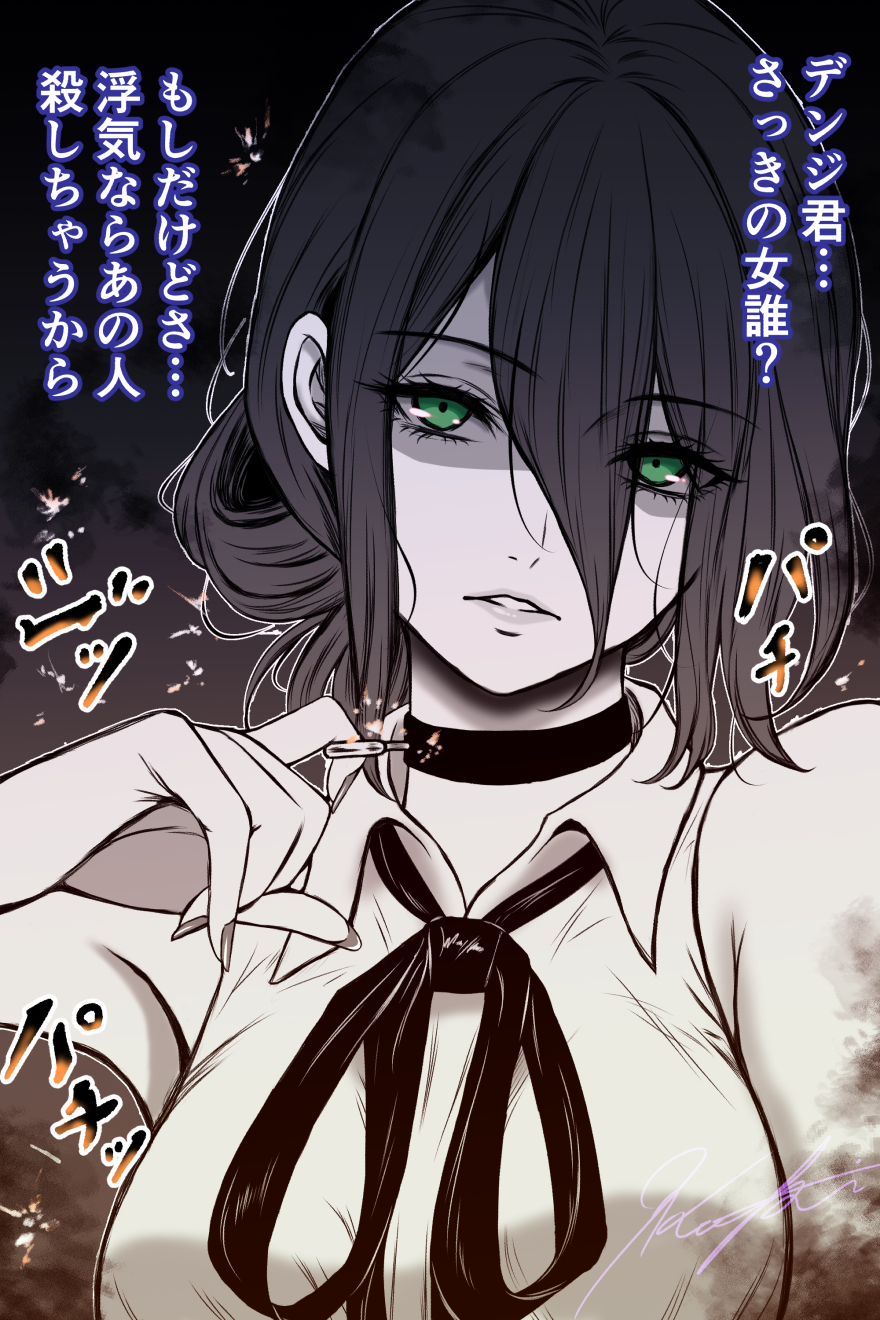 1girlalternate breast size (larger)armpitsbreastschokercollared shirtexpressionlessgreen eyesgrenade pinhair between eyeslarge breastslong hair between eyeslooking at viewerneck ribbonribbonshaded faceshirtsignaturesleevelesssleeveless shirtsolospot colorupper body