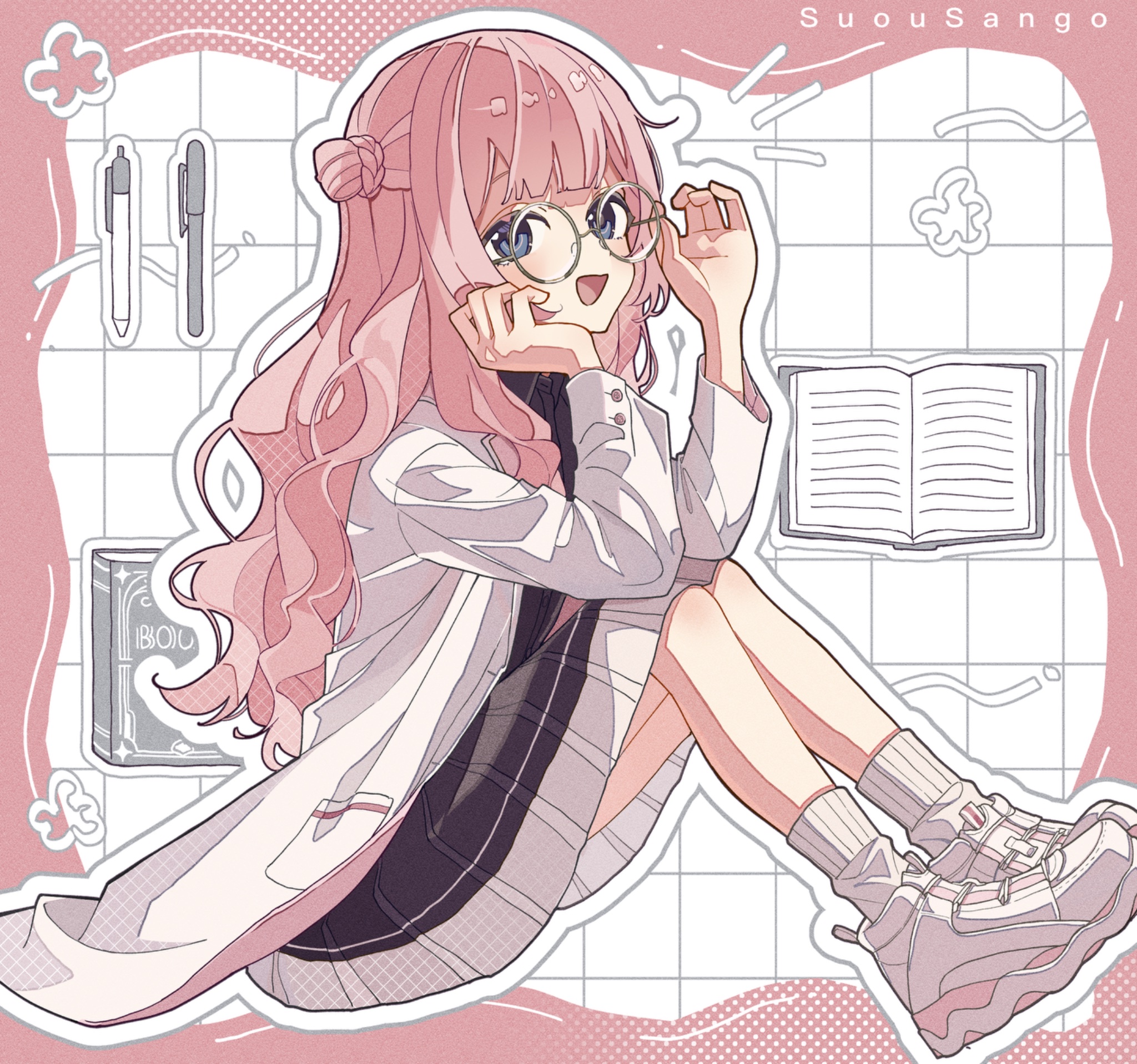 :d1girlblack skirtblue eyesblushbookcharacter namefull bodyglassesgrid backgroundknees uplab coatlong hairlong sleeveslooking at vieweropen bookopen mouthoutlinepenpink hairribbed socksround eyewearshoessittingskirtsmilesneakerssockssolovirtual youtuberwhite backgroundwhite outlinewhite shoeswhite socks