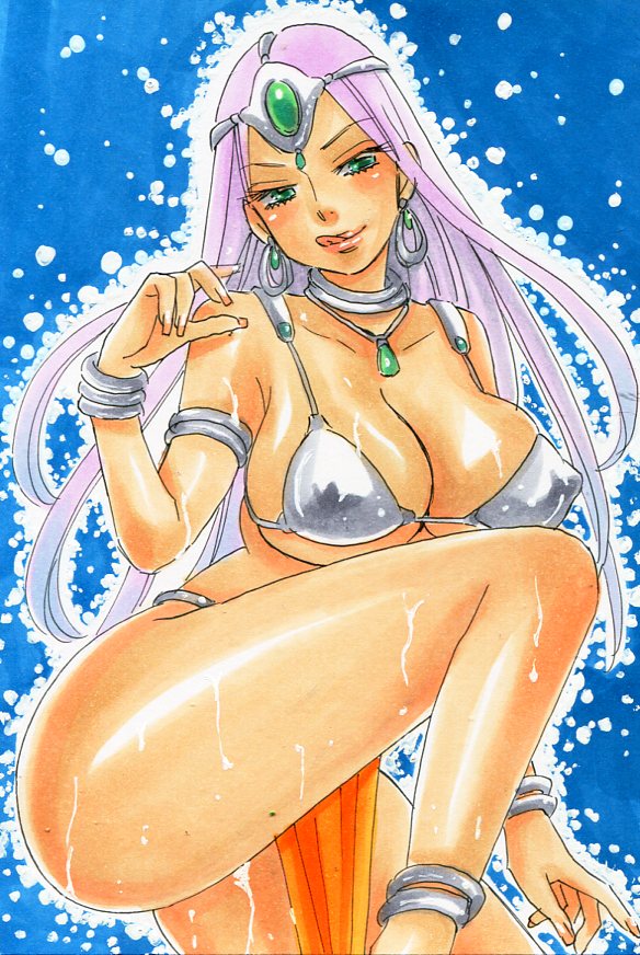 hikami dan, athena, kido saori, saint seiya, translation request, 1girl, beach, bikini, blue eyes, breasts, choker, cleavage, day, female focus, female pubic hair, groin, jewelry, large breasts, lipstick, long hair, lots of jewelry, lying, makeup, nail polish, necklace, nipples, on side, pubic hair, purple hair, smile, solo, swimsuit, very long hair