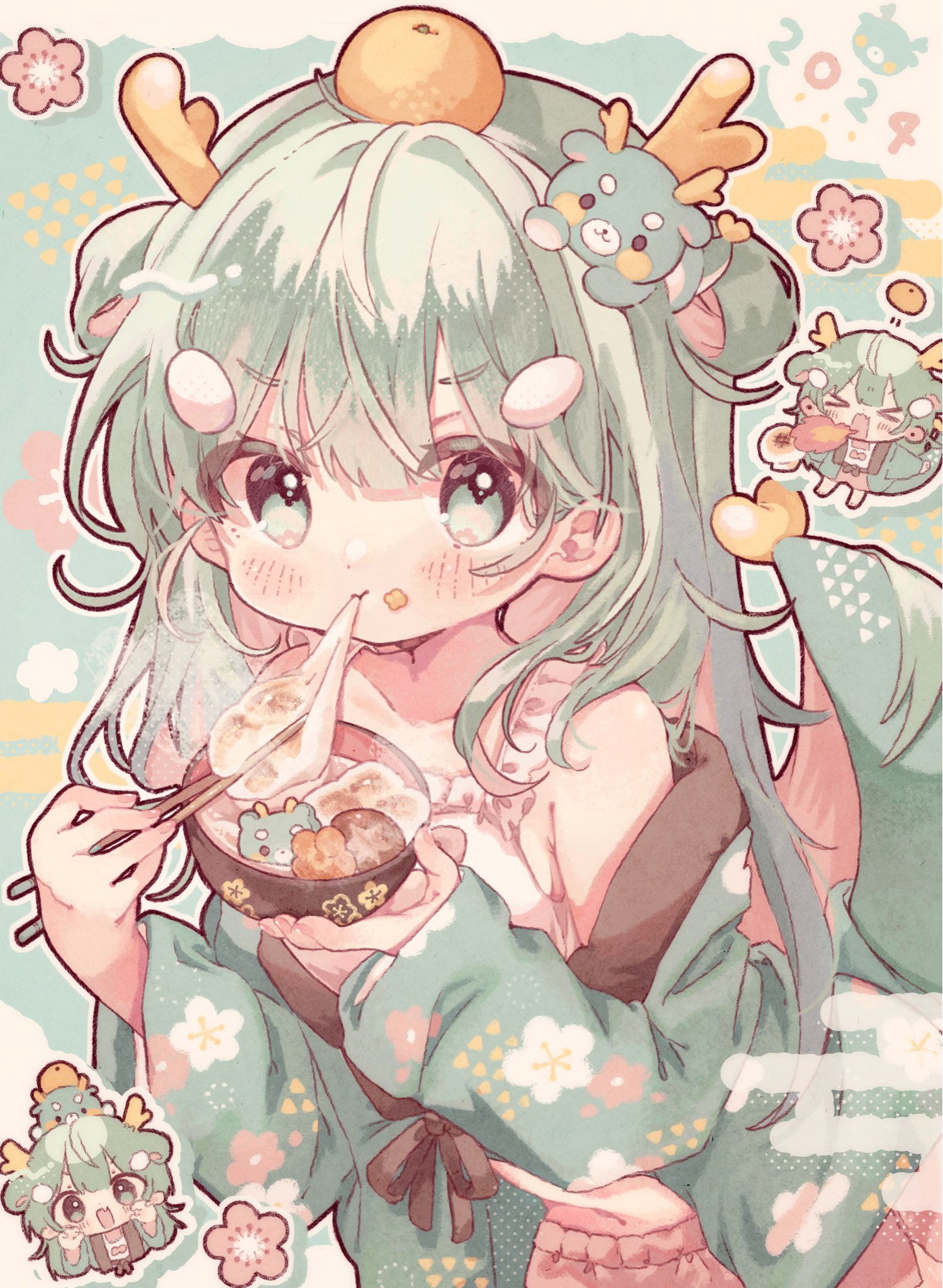 1girlantlersbare shouldersblushbowlchibichopsticksclosed mouthcollarboneeatingfoodfood on headfruitfruit on headgreen backgroundgreen eyesgreen hairgreen shirtholdingholding bowlholding chopstickshornslong hairlooking at viewermandarin orangenavelnew yearobject on headoff shoulderoutlineshirtupper bodywhite outlineyellow hornszouni soup