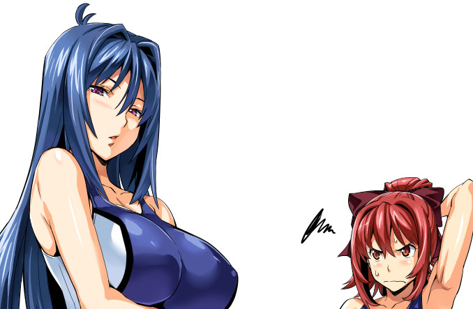 2girlsarm uparmpitsblushbreast envybreastscompetition swimsuithuge breastslarge breastslooking at breastsmultiple girlsone-piece swimsuitpurple eyesred hairsimple backgroundswimsuitupper bodywhite background