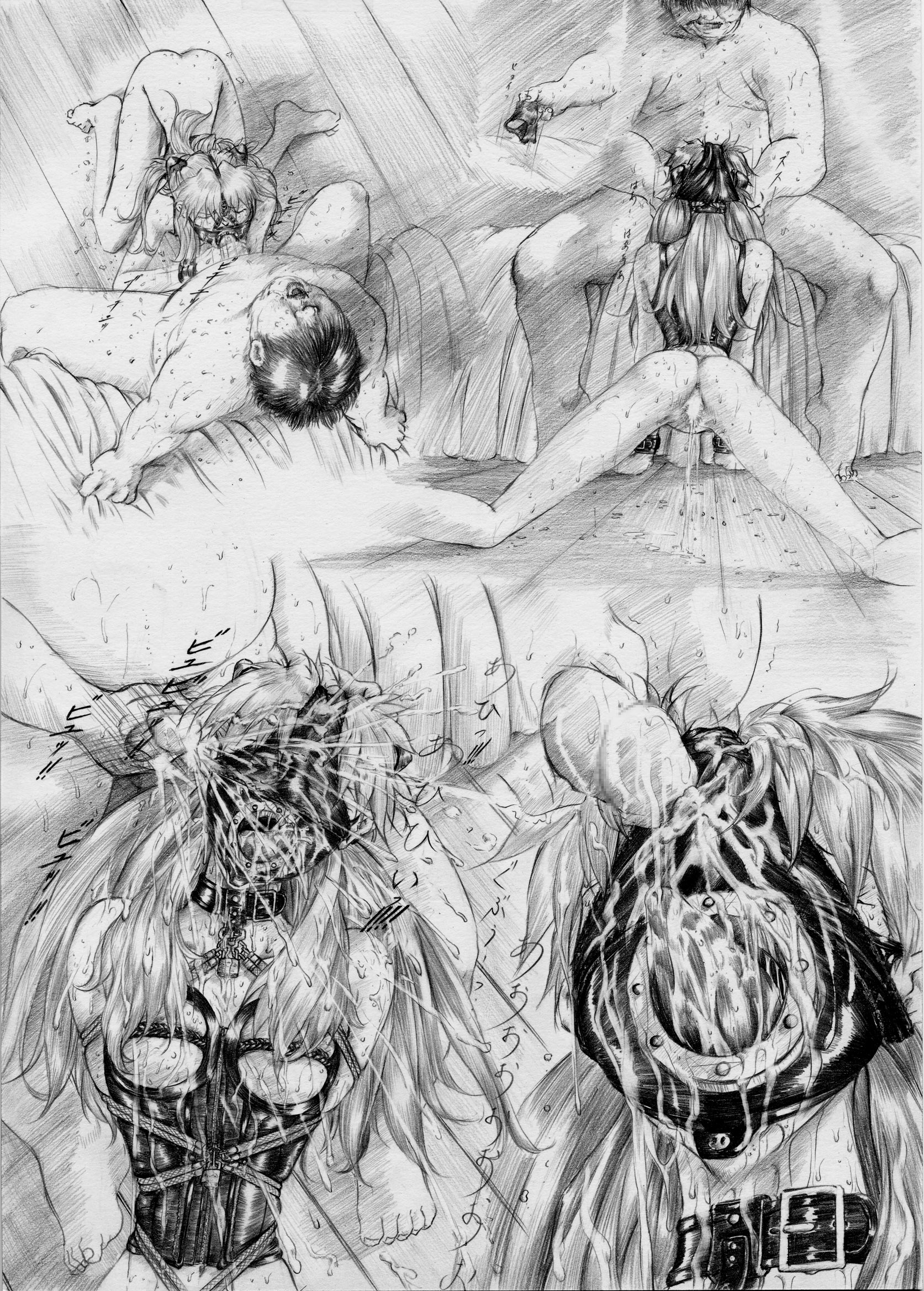 gao (gaolukchup), loogchoob (gaolukchup), original, highres, 1girl, after fellatio, black hair, breasts, brown eyes, censored, cleavage, cum, cum on body, duck hair ornament, facial, hair ornament, high ponytail, large breasts, medium hair, mosaic censoring, naked towel, open mouth, oral, paizuri, penis, ponytail, signature, simple background, smile, towel, watermark, white background