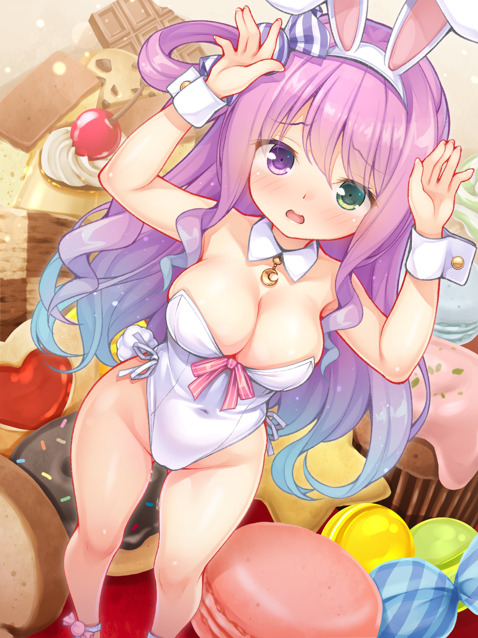 1girlanimal ear hairbandanimal earsarms upblue hairblushbreastscandycandy hair ornamentcleavagecovered naveldetached collardonutfake animal earsfoodfood-themed hair ornamentgradient hairgreen eyeshair ornamenthairbandheterochromiahighleghighleg leotardlarge breastsleotardlong hairlooking at viewermacaronmulticolored hairone side upopen mouthpink hairplayboy bunnypurple eyesrabbit ear hairbandrabbit earsrabbit posesolostraplessstrapless leotardvirtual youtuberwhite leotardwrist cuffs