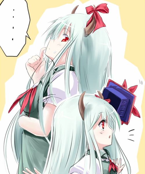 1boy2girlsdressdual personafemale focusfrom sidegreen dresshatheight differencehornslooking at viewerlooking to the sidemultiple girlspuffy short sleevespuffy sleevesred eyesshort sleevesspeech bubblespoken ellipsistate eboshi