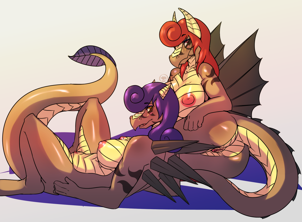 breastsdragonfemaleFlag for Deletionhairhornlooking at viewernipplespurple hairpussyred eyesred hairscalesspikeswingsyellow eyes