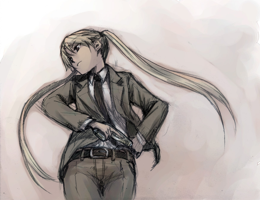 00s1girlblonde haircross-drawdark skindark-skinned femalefemale focusformal clothesgunhandgunlong hairpant suitpantssketchsolosuittrigger disciplinetwintailsvery long hairweapon