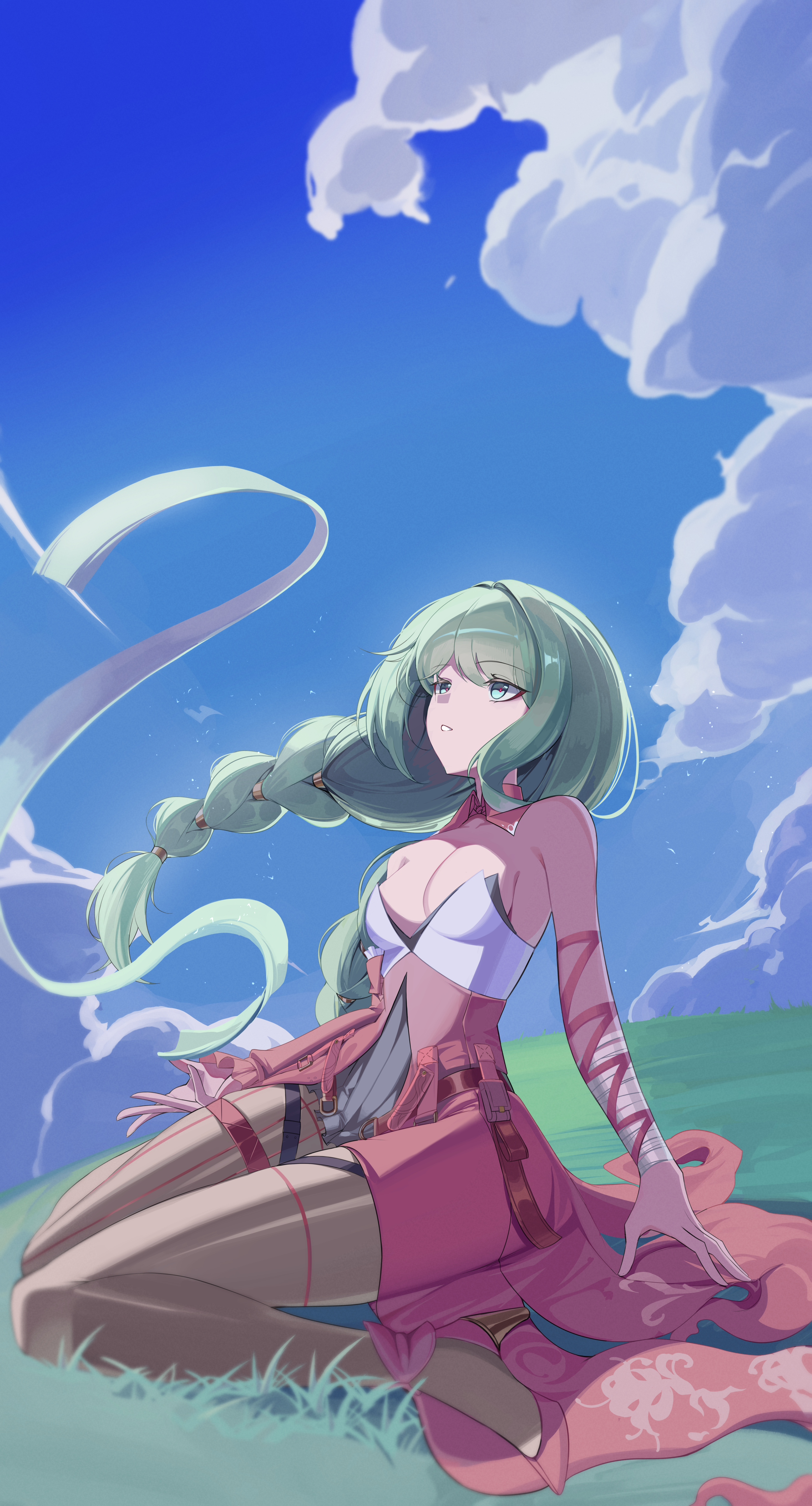1girlbandaged armbandagesbare shouldersblack pantyhoseblack skirtblue skybraidbreastsdaydetached collardetached sleevesdressgrey eyesgrey hairlong hairlooking uplow twin braidsmedium breastsoutdoorspantyhoseparted lipsred dresssingle detached sleevesittingskirtskysolotwin braids