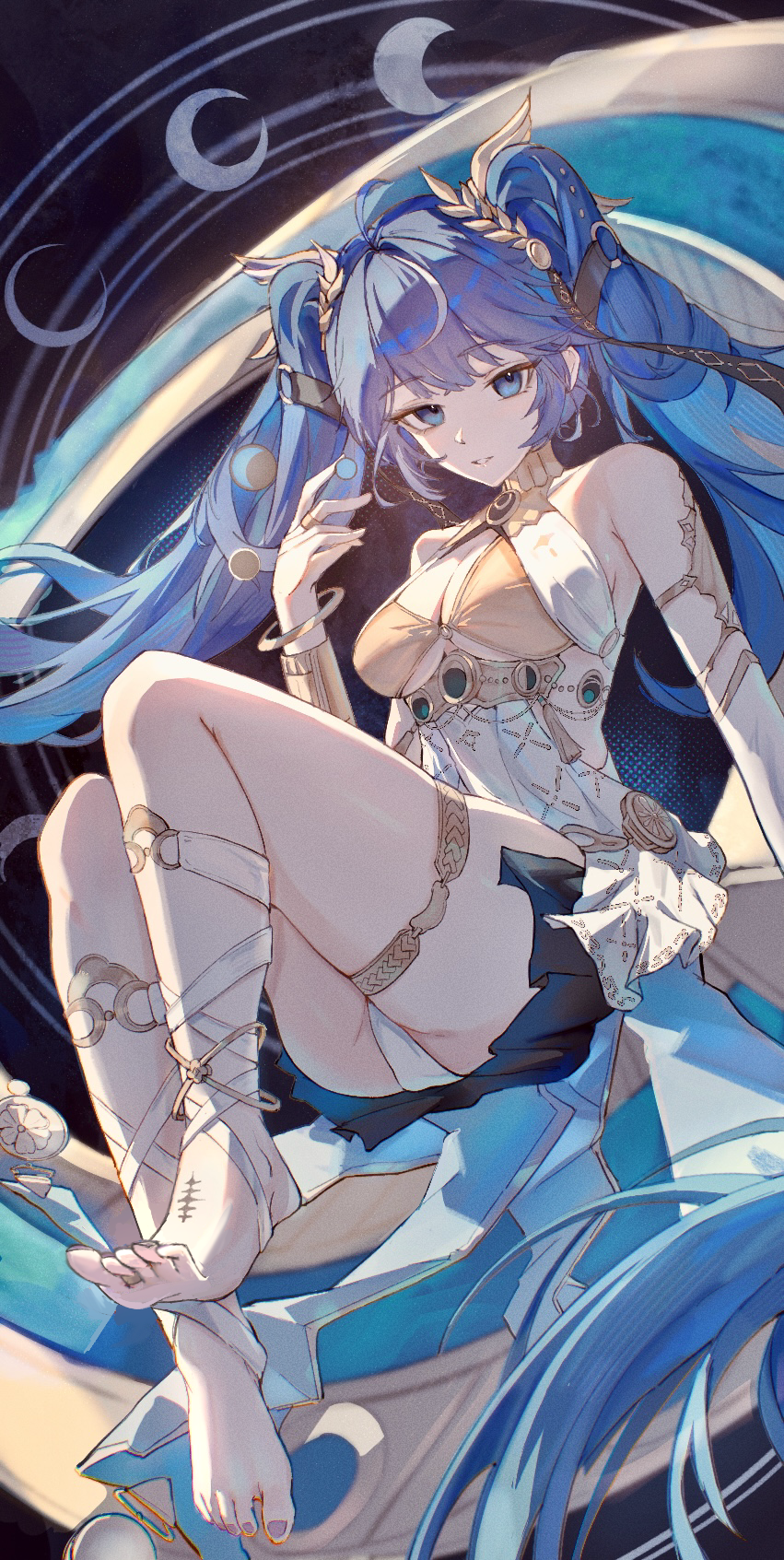1girlahogeancient greek clothesbare shouldersbarefootblack skirtblue eyesblue hairbreastsfeetfull bodygold bragreco-roman clotheshair belthand upjewelrylaurel crownleg wraplong hairmedium breastsminiskirtmulticolored hairparted lipsskirtsmilesolostreaked hairtacet mark (wuthering waves)thighlettoestwintailsvery long hair