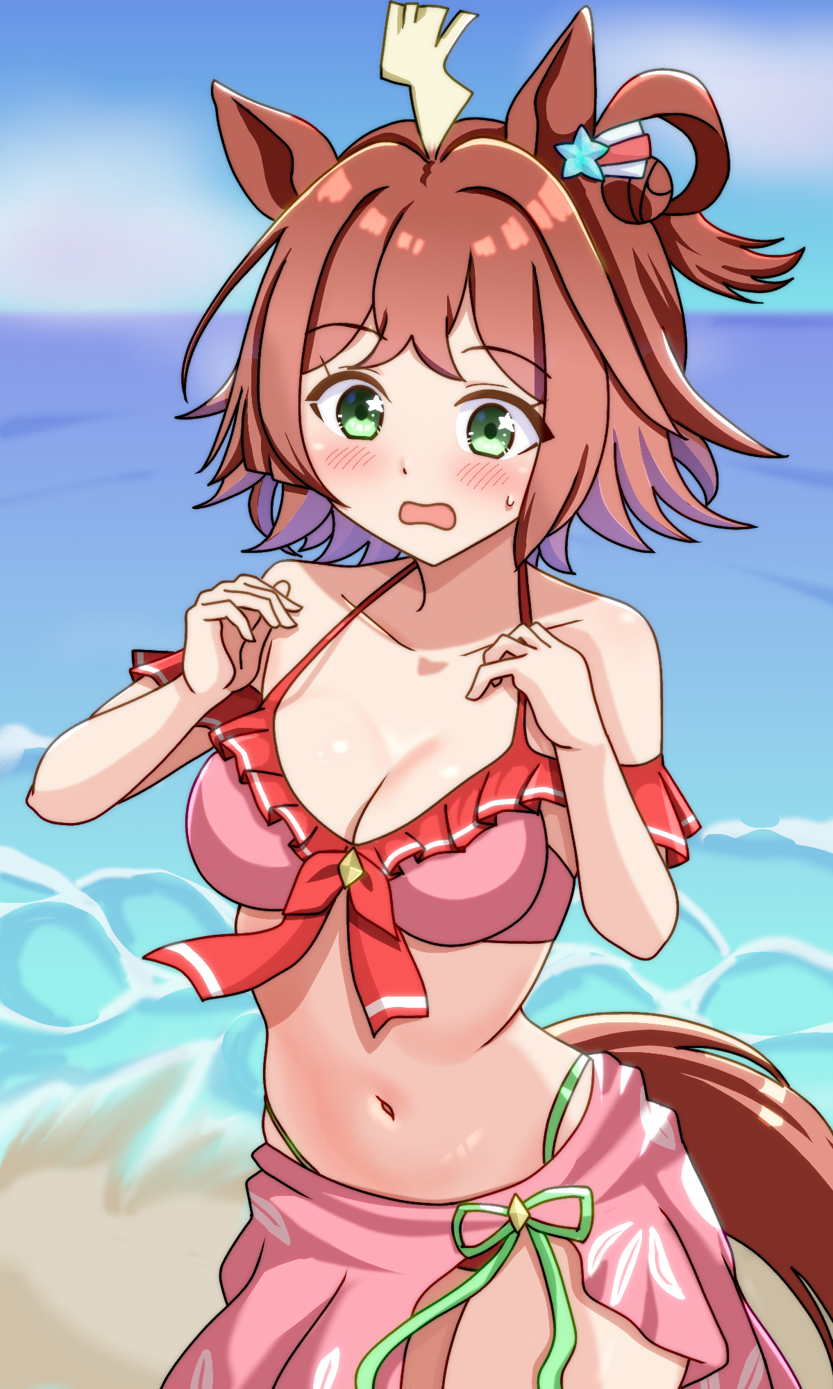 ment, original, 1girl, ahoge, blue eyes, blue hair, breasts, cleavage, collar, cropped jacket, female focus, huge ahoge, jacket, jewelry, matching hair/eyes, navel, necklace, no bra, no panties, open clothes, open jacket, open pants, pants, short hair, solo, unbuttoned, undressing, unzipped