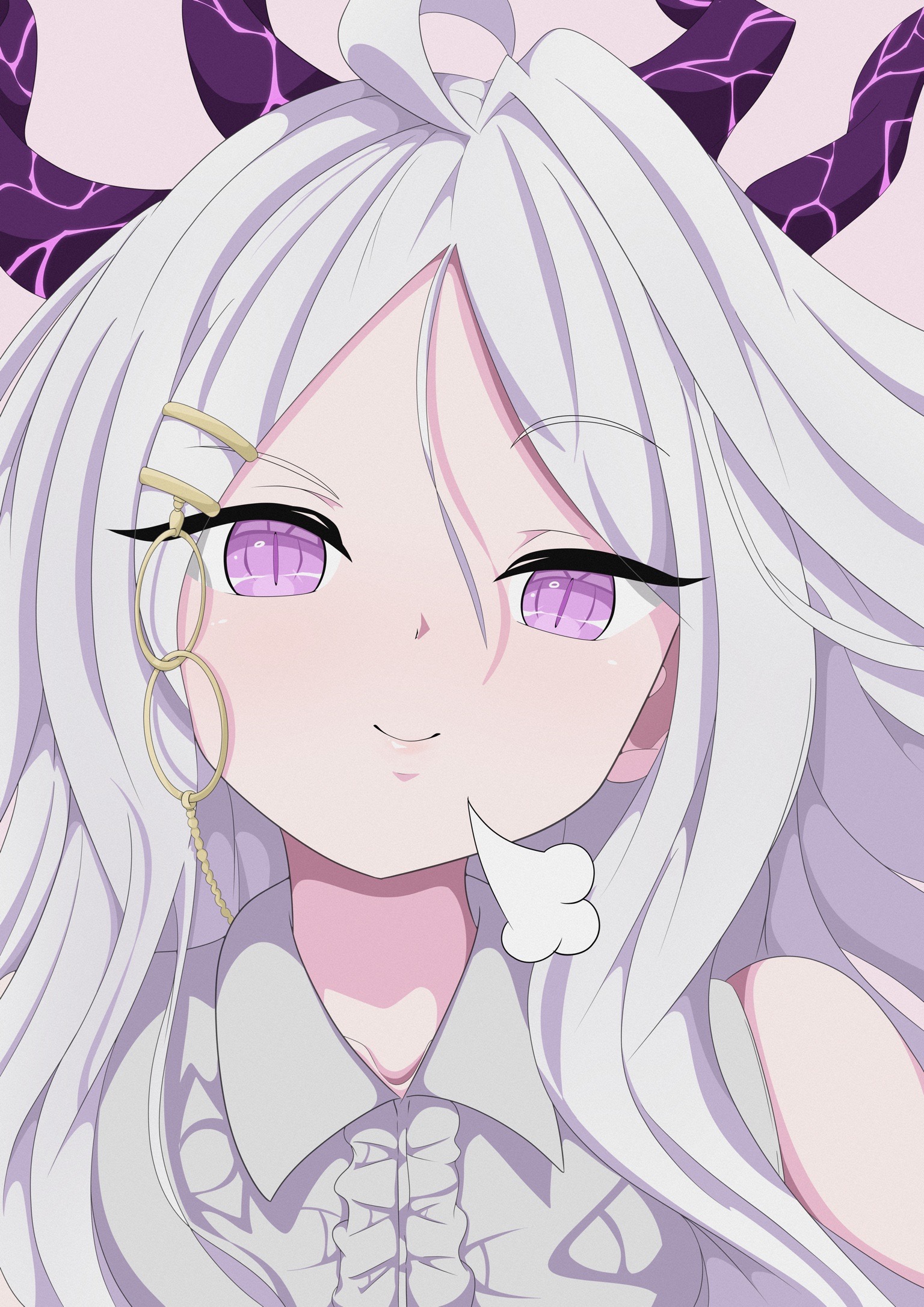 runamonet, zani (wuthering waves), wuthering waves, absurdres, commentary, highres, 1girl, ahoge, arm behind head, arm pouch, arm up, artist name, black gloves, black horns, black jacket, black pants, breasts, chest harness, choker, closed mouth, collared shirt, curled horns, earrings, gloves, grey choker, harness, high-waist pants, horns, jacket, jacket on shoulders, jewelry, key earrings, large breasts, long hair, looking at viewer, mole, mole under eye, necktie, pants, red eyes, red necktie, shirt, shirt tucked in, signature, single earring, solo, upper body, white hair, white shirt
