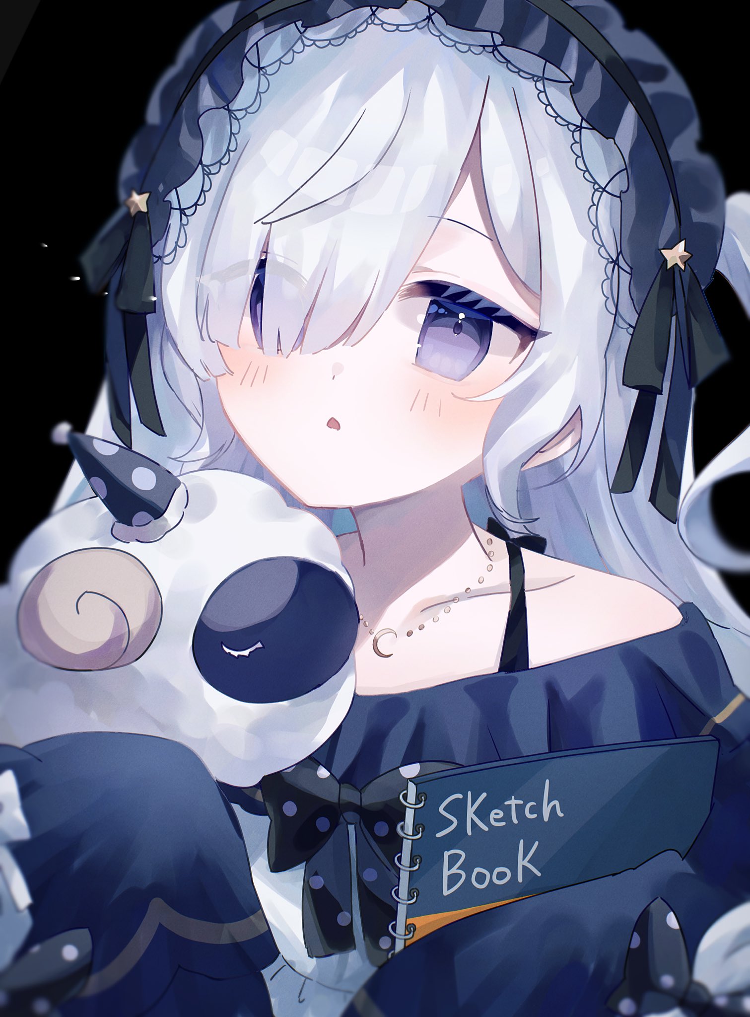 1girlblack backgroundblack bowbowdressfrilled dressfrillsgothic lolitahair over one eyehairbandholdingholding sketchbooklolita fashionlolita hairbandlong hairlong sleeveslooking at viewermagical girlone side upotomiya (woto 103)purple eyessketchbooksolostuffed animalstuffed sheepstuffed toyupper bodywhite hair