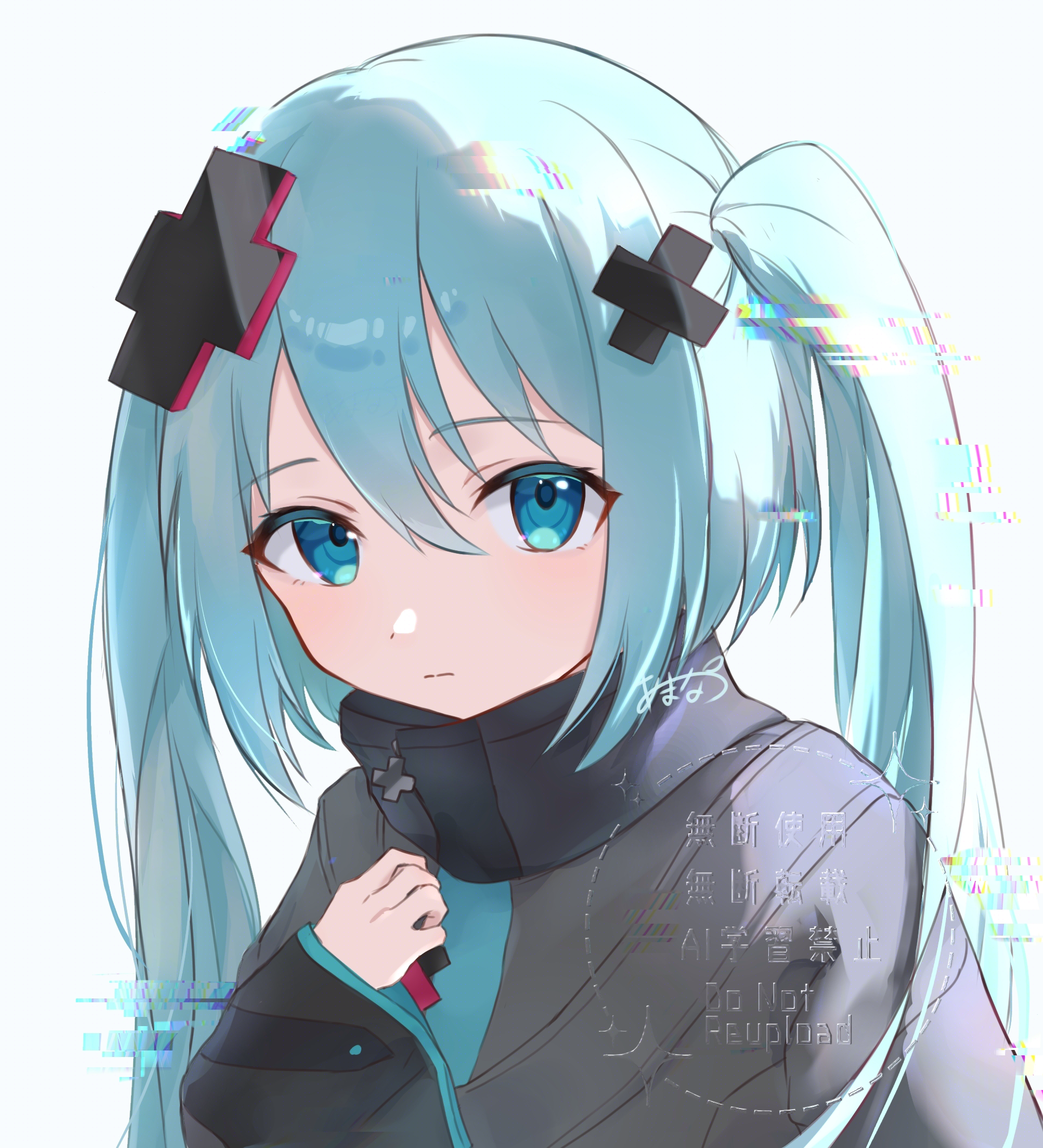 1girlaqua eyesaqua hairglitchgrey jackethair between eyeshair ornamentjacketlong sleeveslooking at viewernatumikan mosimple backgroundsoloturtleneckturtleneck jackettwintailswhite backgroundwide sleevesx hair ornament