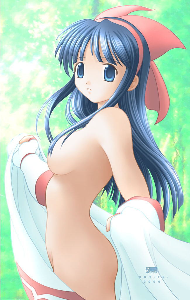 1girlassblue eyesblue hairbreastscapeconvenient censoringglovesgluteal foldhair ribbonlong hairlooking at viewermedium breastsnudeparted lipsribbonsideboobthighhighsthighs
