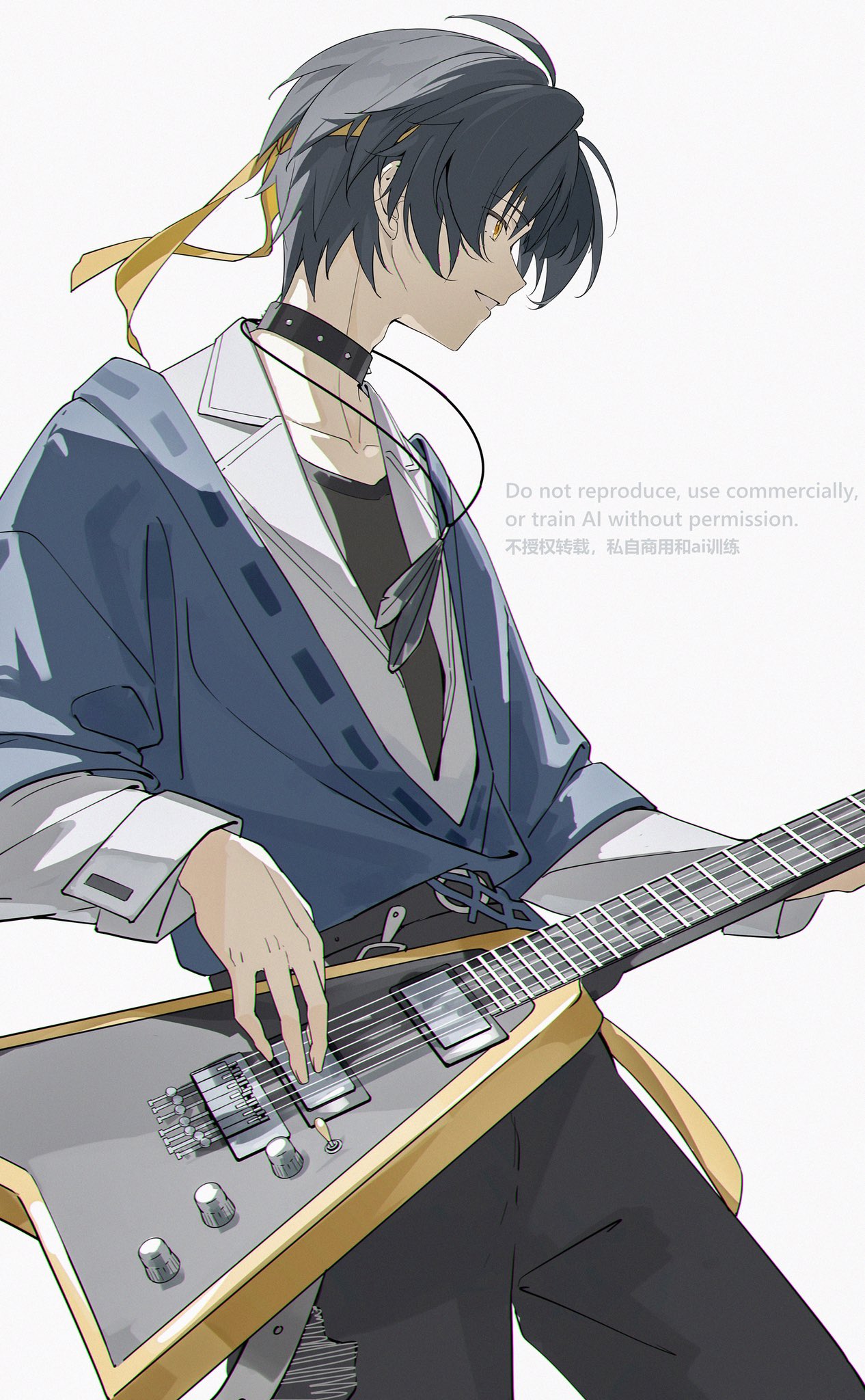 1boyaccessoriesbeltblack hairblack pantsblack shirtblue jacketcollarfrom sideguitarheadbandholdingholding guitarholding instrumentinstrumentjacketjewelrymusicnecklacepantsplaying instrumentshirtshort hairsmilesolospiked collarspikesteethwhite backgroundwhite shirtyellow eyesyellow headband