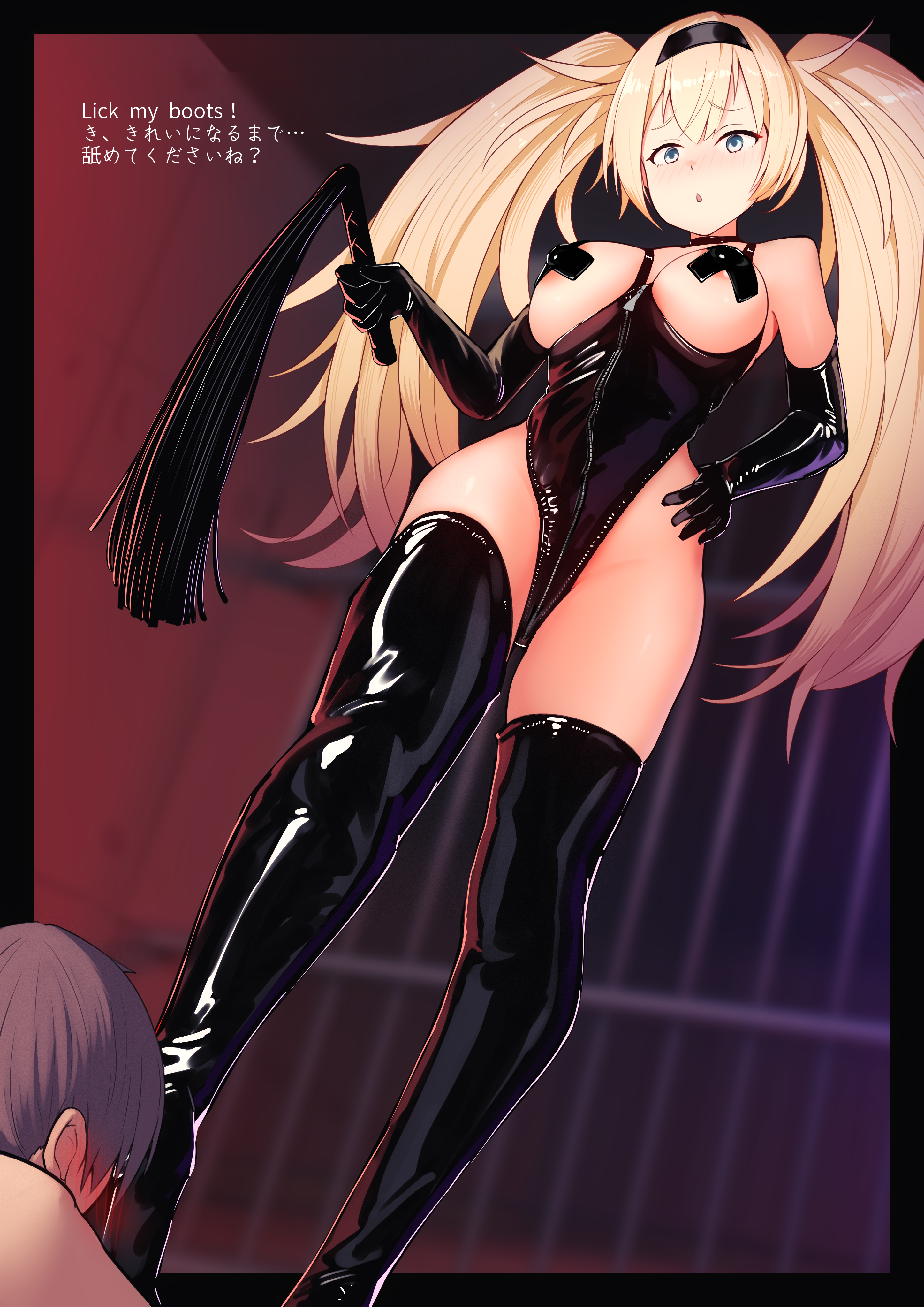 1boy1girlbdsmblonde hairblue eyesbondage outfitbootsbreastless clothesdominatrixelbow glovesfemdomfloggergloveshairbandhand on own hiplong hairlooking at viewerpastiesshiny clothesstandingtapetape on nipplesthigh bootstwintails