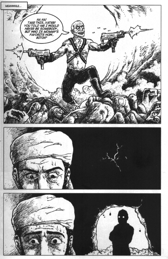 beardcomicdual wieldingfacial hairgunholdingleft-to-right mangamonochromesubmachine gunturbanuziweapon