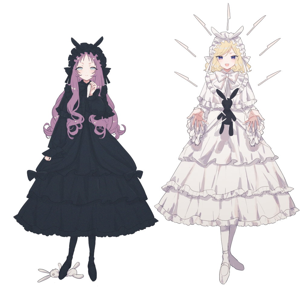 2girlsblack dressblack headdressblack shoesblonde hairblue eyeschoppy bangsclosed mouthcordelia (fuyuki)dressfloatingfloating objectfrilled dressfrillsfull bodyhand upheaddressknifelong hairlong sleeveslooking at viewermultiple girlsopen mouthparted bangspurple hairshoessimple backgroundsmilesteppingstraight-onstuffed animalstuffed rabbitstuffed toywhite backgroundwhite dresswhite headdresswhite shoes