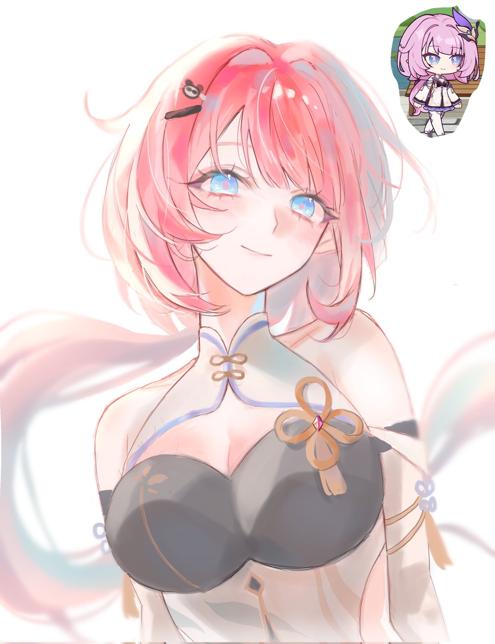 1girlbare shouldersblue eyesbreastscleavage cutoutclothing cutoutdresselflarge breastslong hairlooking at viewerofficial alternate costumepink hairpointy earsreference insetsimple backgroundsmilesolossamsa0404upper bodyvery long hairwhite backgroundwhite dress
