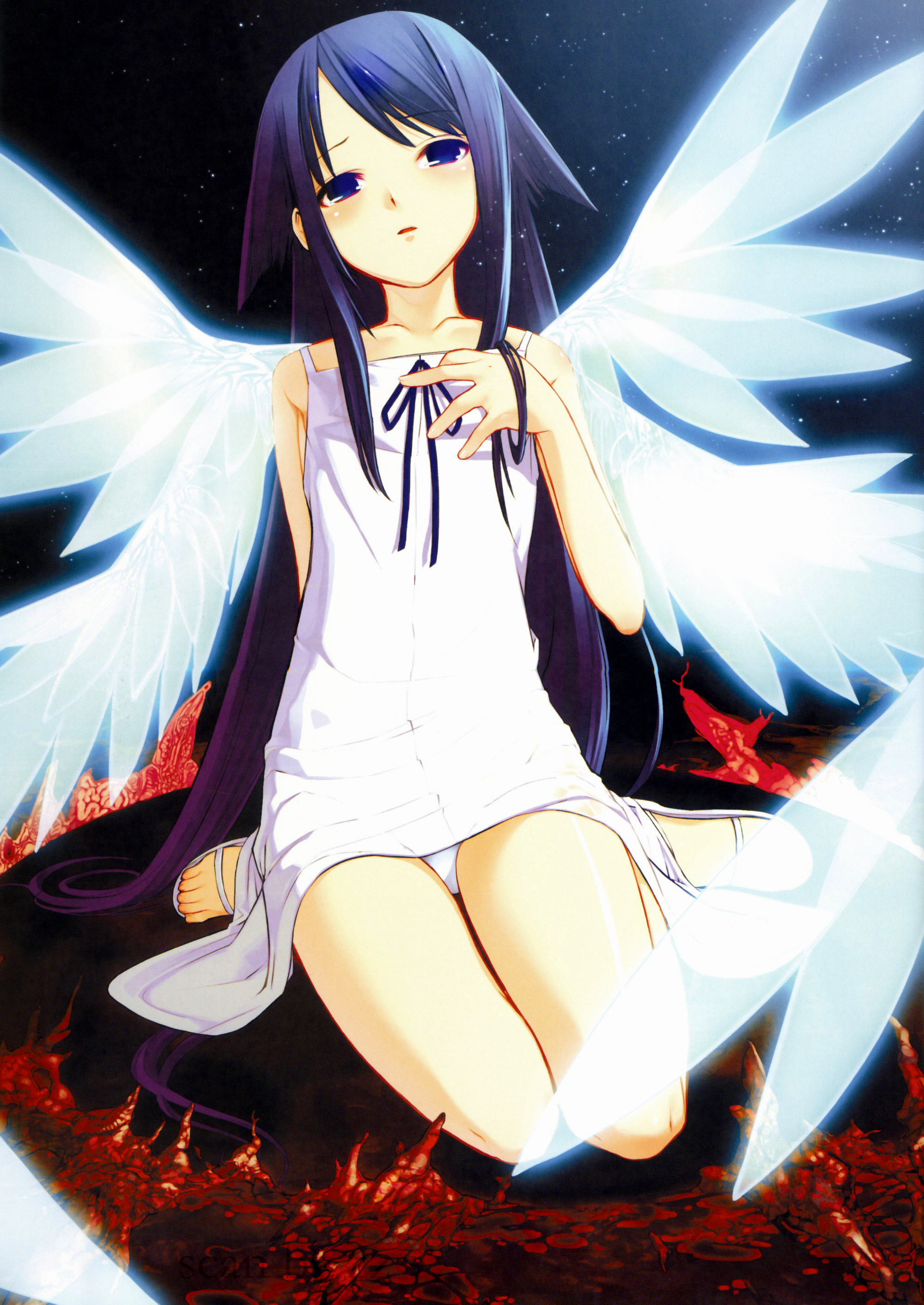 1girlarm behind backblue eyesblue hairdarkfemale focusfull bodyhair flapshalf-closed eyeshand in own hairlong hairmatching hair/eyespantiespantyshotsandalssittingsoloswept bangsunderwearvery long hairwhite sandalswings